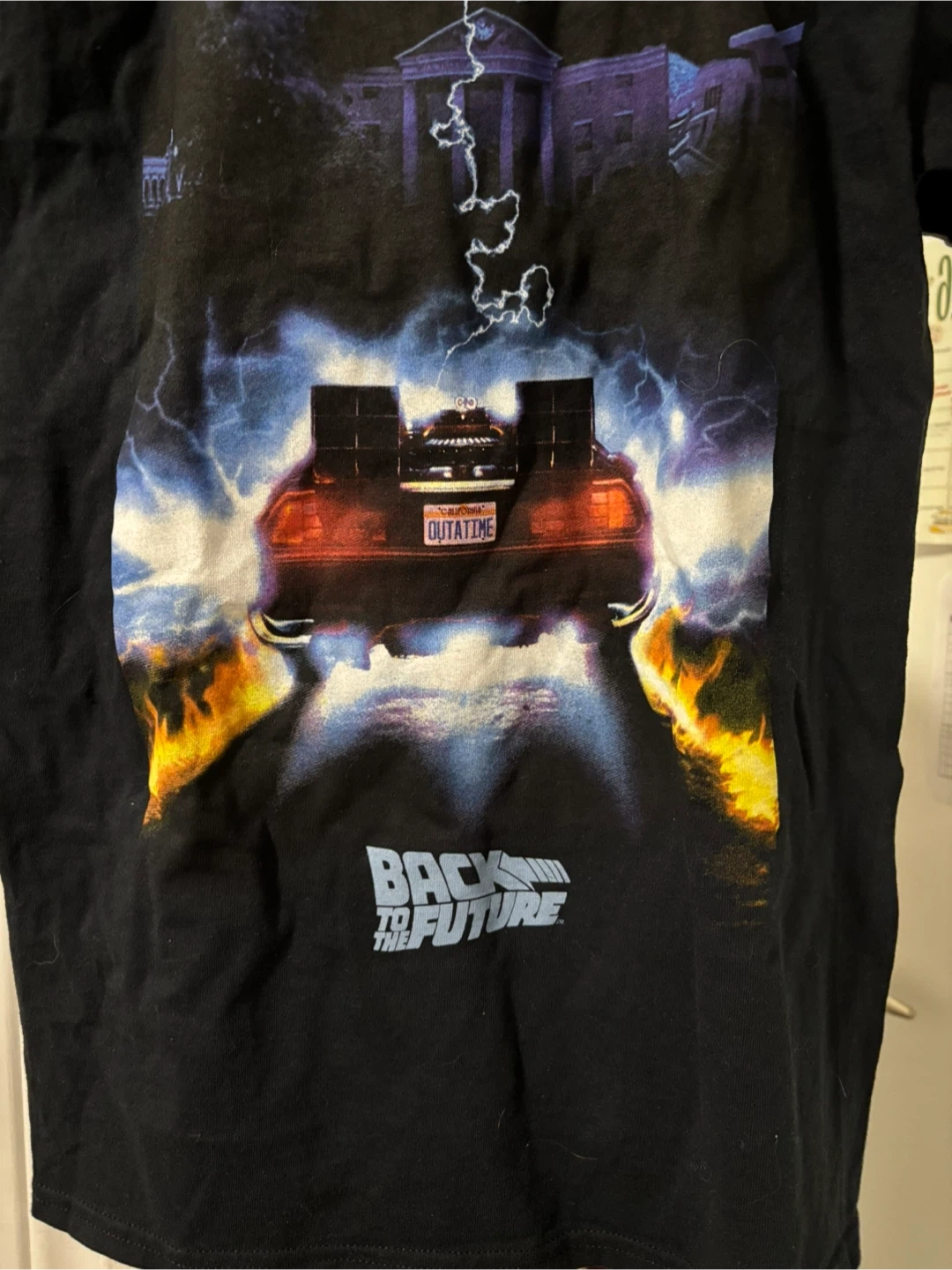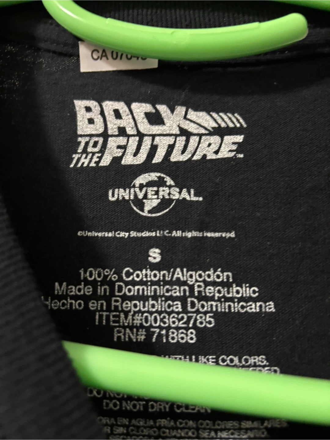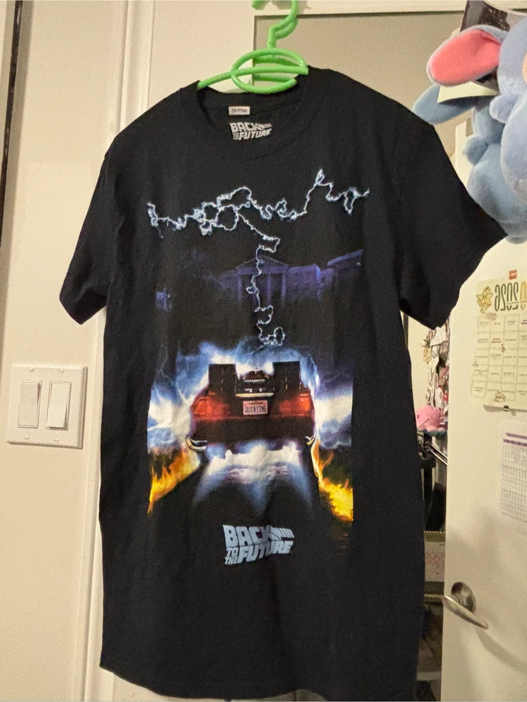 This black t-shirt features the iconic DeLorean time machine from Back to the Future. It's made from 100% cotton. This shirt is a size small.