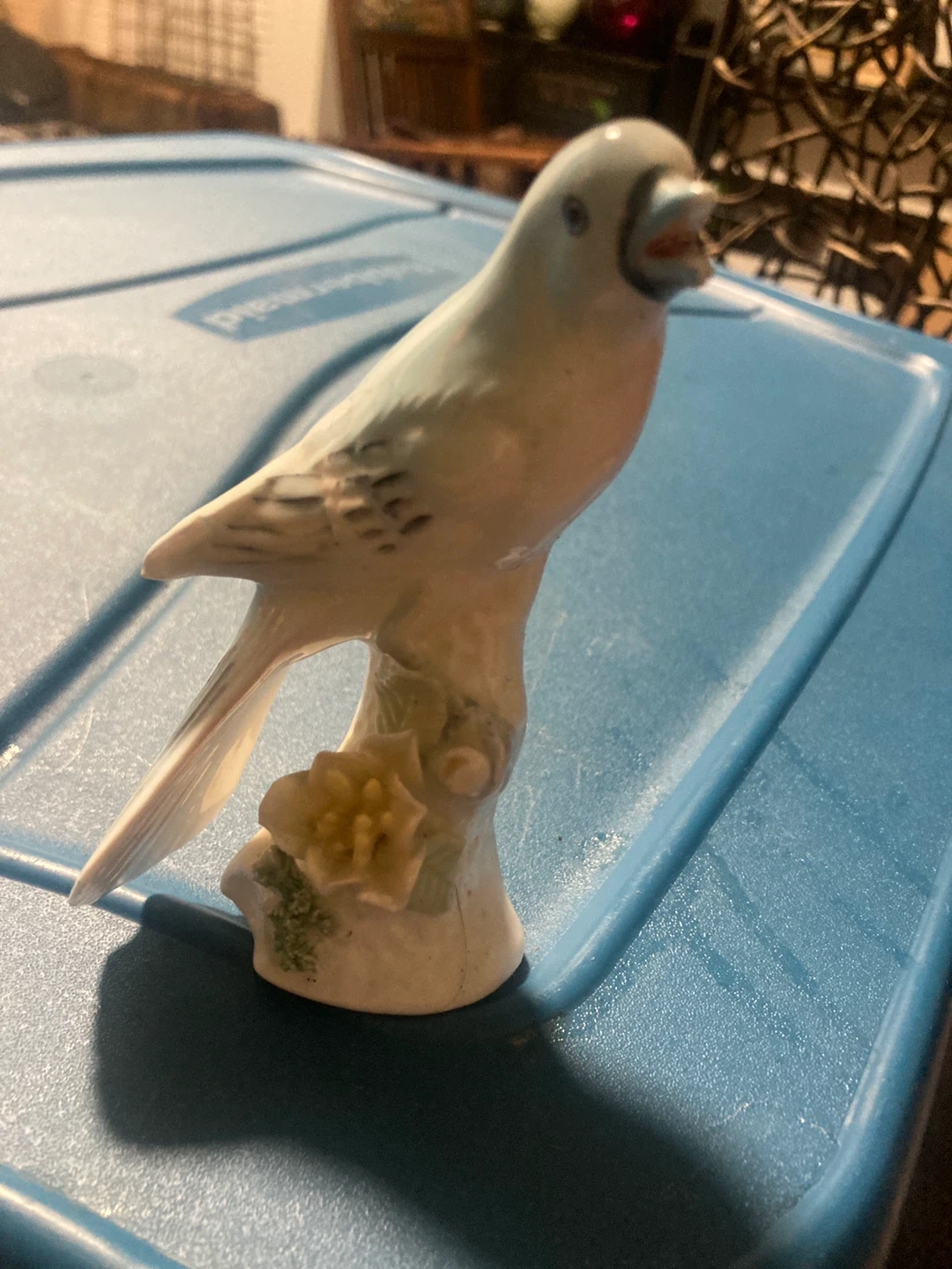 This is a vintage porcelain figurine of a blue bird, made in Japan. It features delicate detailing and a small flower accent at its base. A charming decorative piece for any shelf!