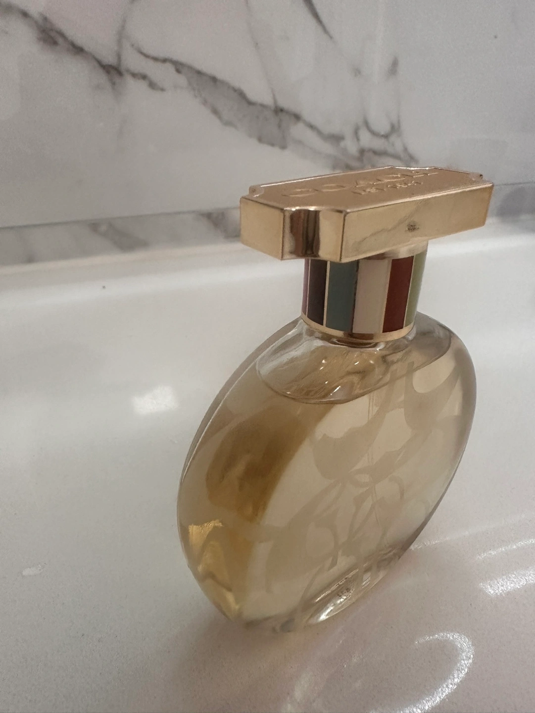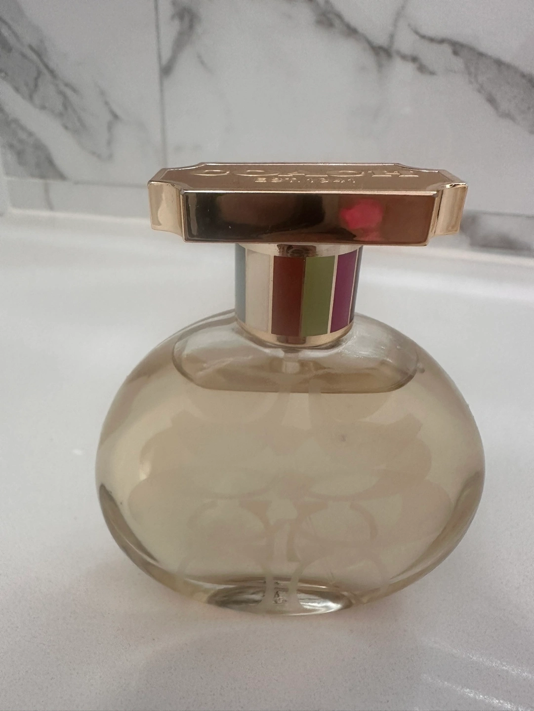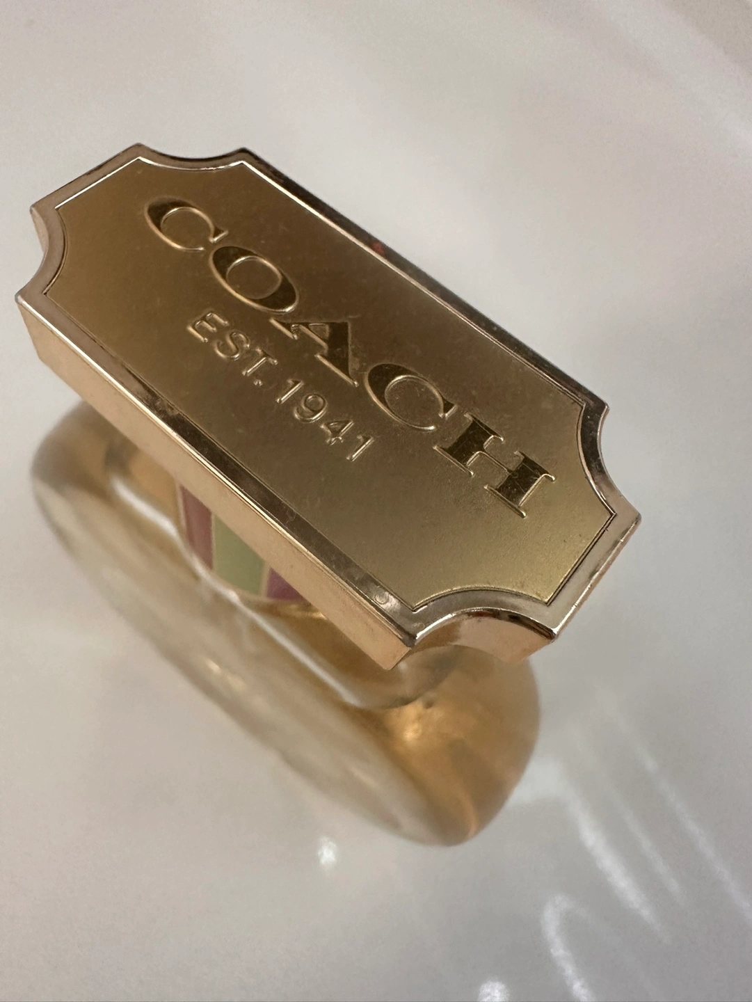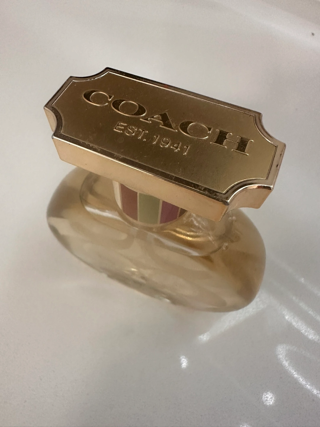 A bottle of Coach perfume. It is a 75 ml bottle. The bottle is shaped like a heart and features a gold lid with the Coach logo and "Est. 1941" engraved. The box is not included.