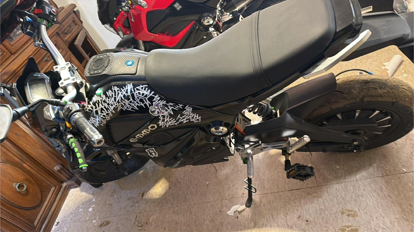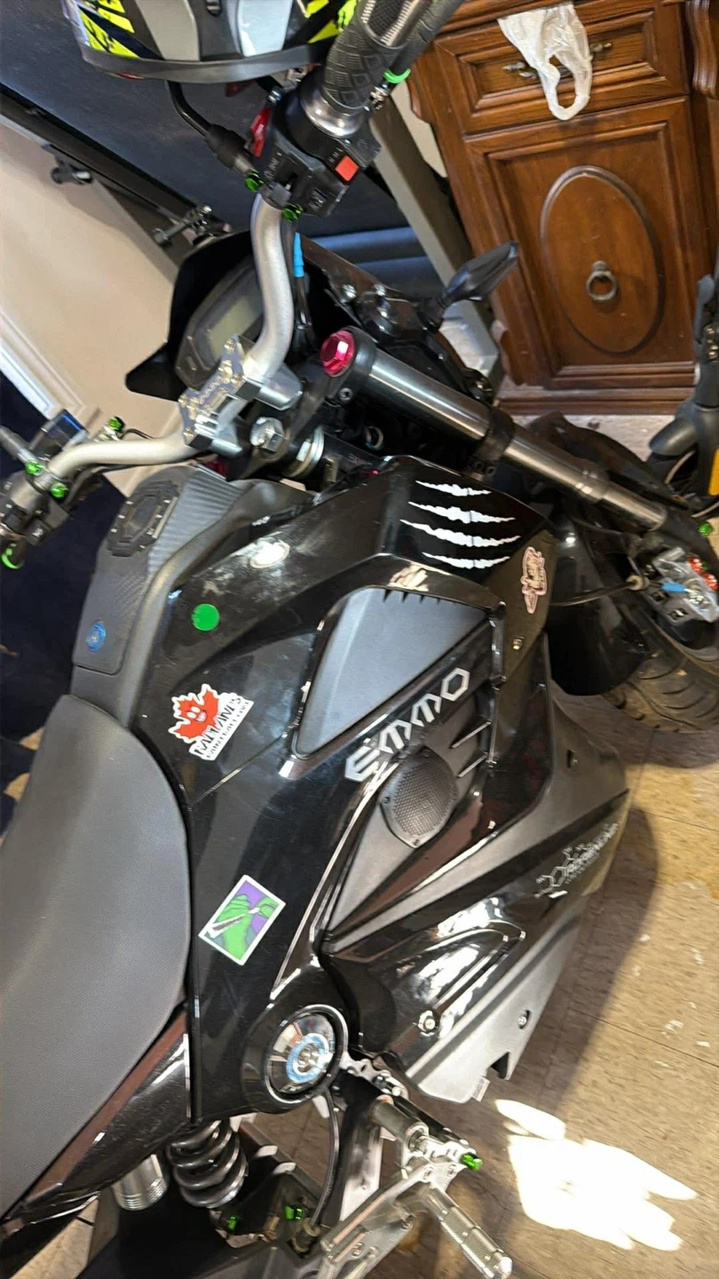 This is an EMMX electric motorcycle. It features a sleek black design with custom decals. Perfect for urban commuting or recreational riding! 72v/50 lithium battery and goes up to 90 km fast on a full charge. Comes with two sets of keys and a helmet.