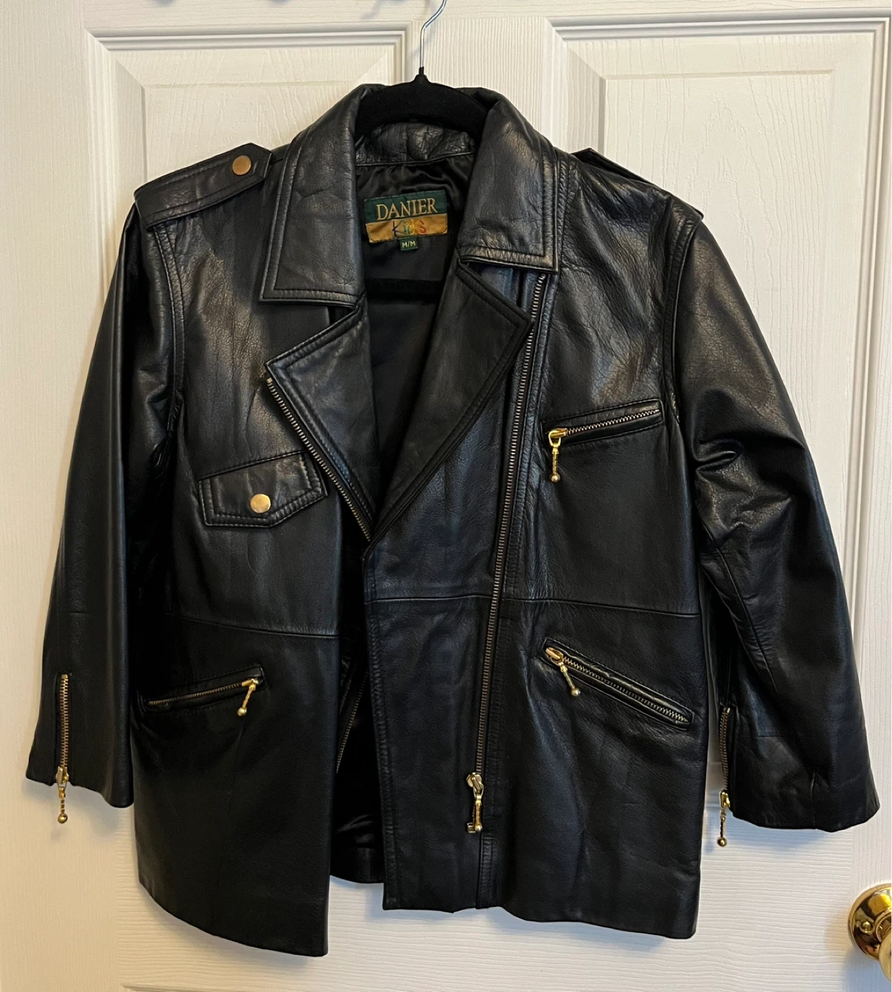 Black Danier leather moto jacket with gold hardware. Classic biker style with zippered pockets and cuffs. This jacket's genuine leather and timeless design make it a wardrobe staple. Size medium.