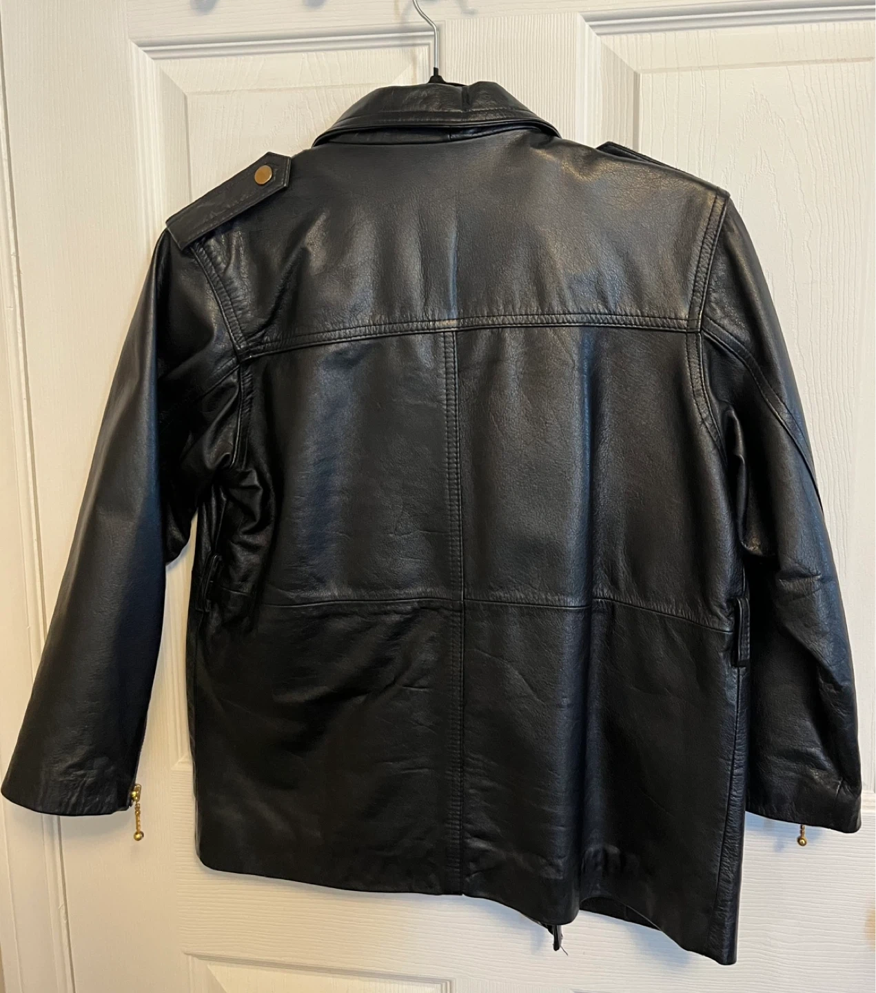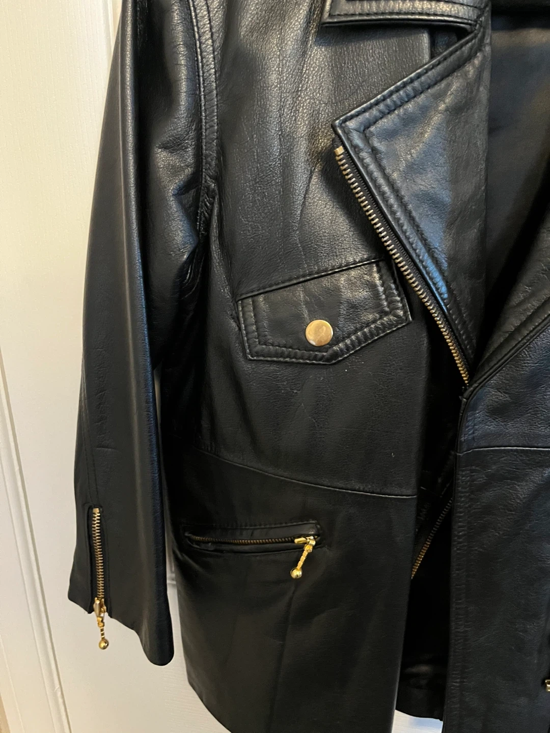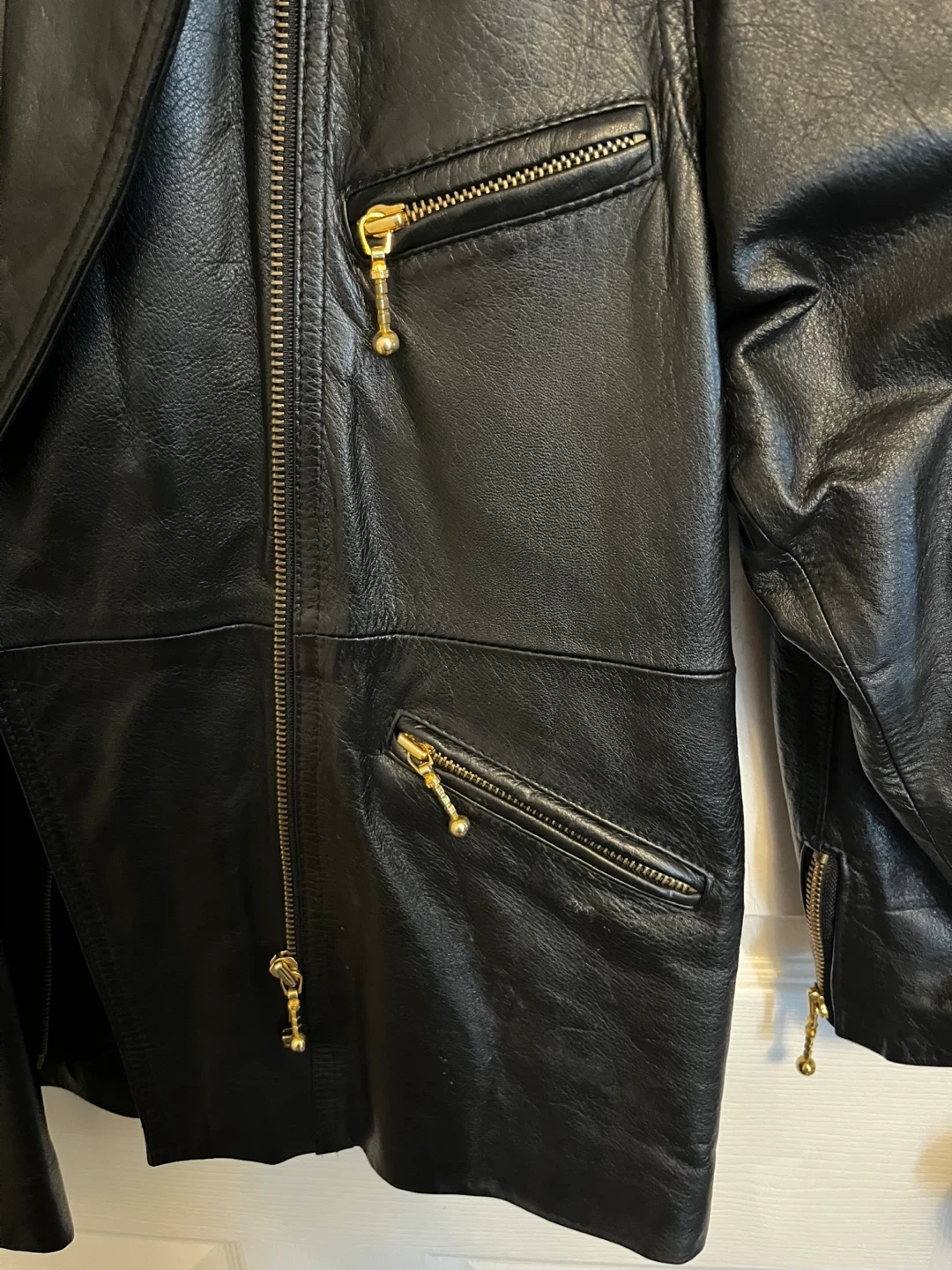 Black Danier leather moto jacket with gold hardware. Classic biker style with zippered pockets and cuffs. This jacket's genuine leather and timeless design make it a wardrobe staple. Size medium.