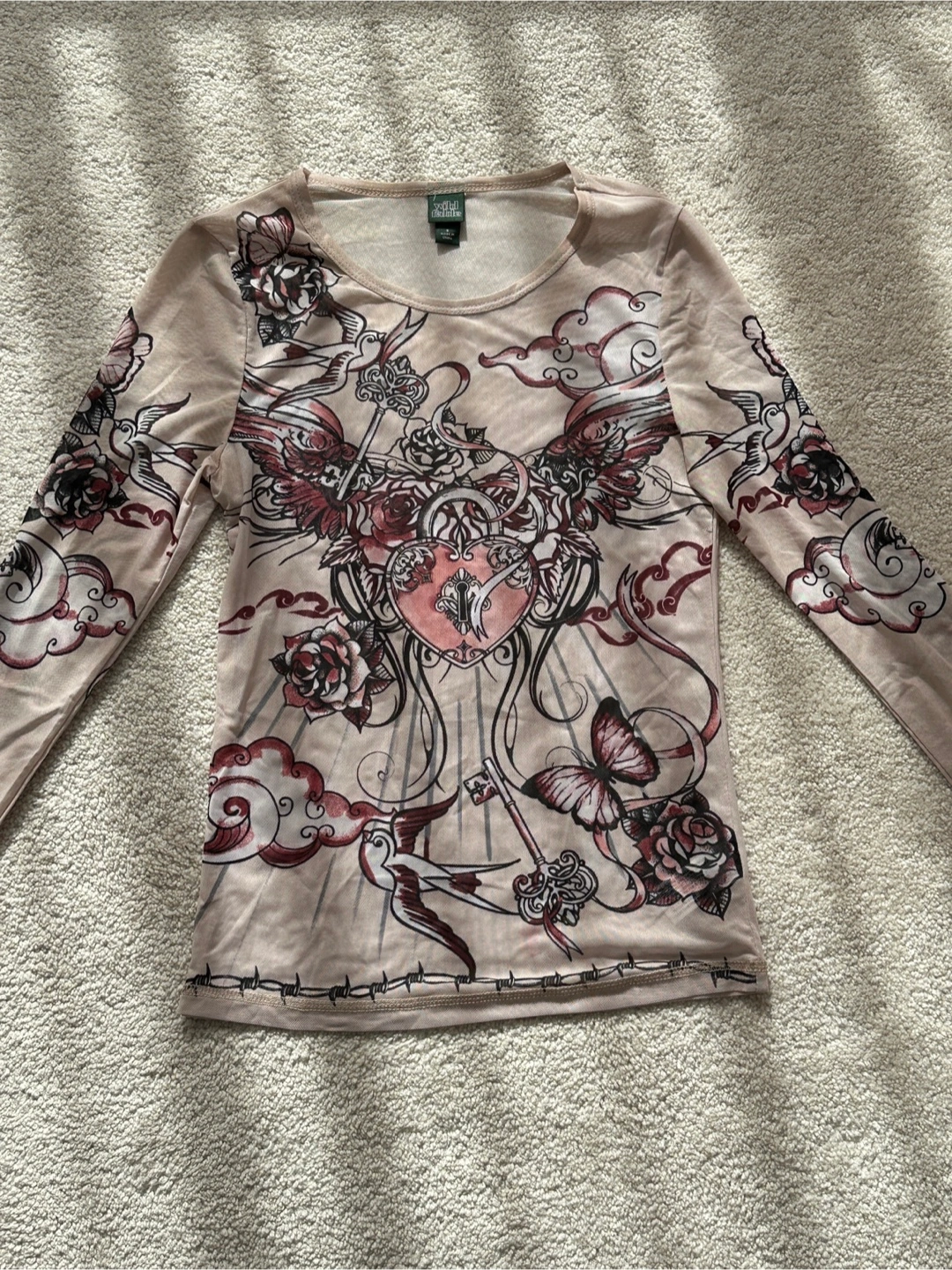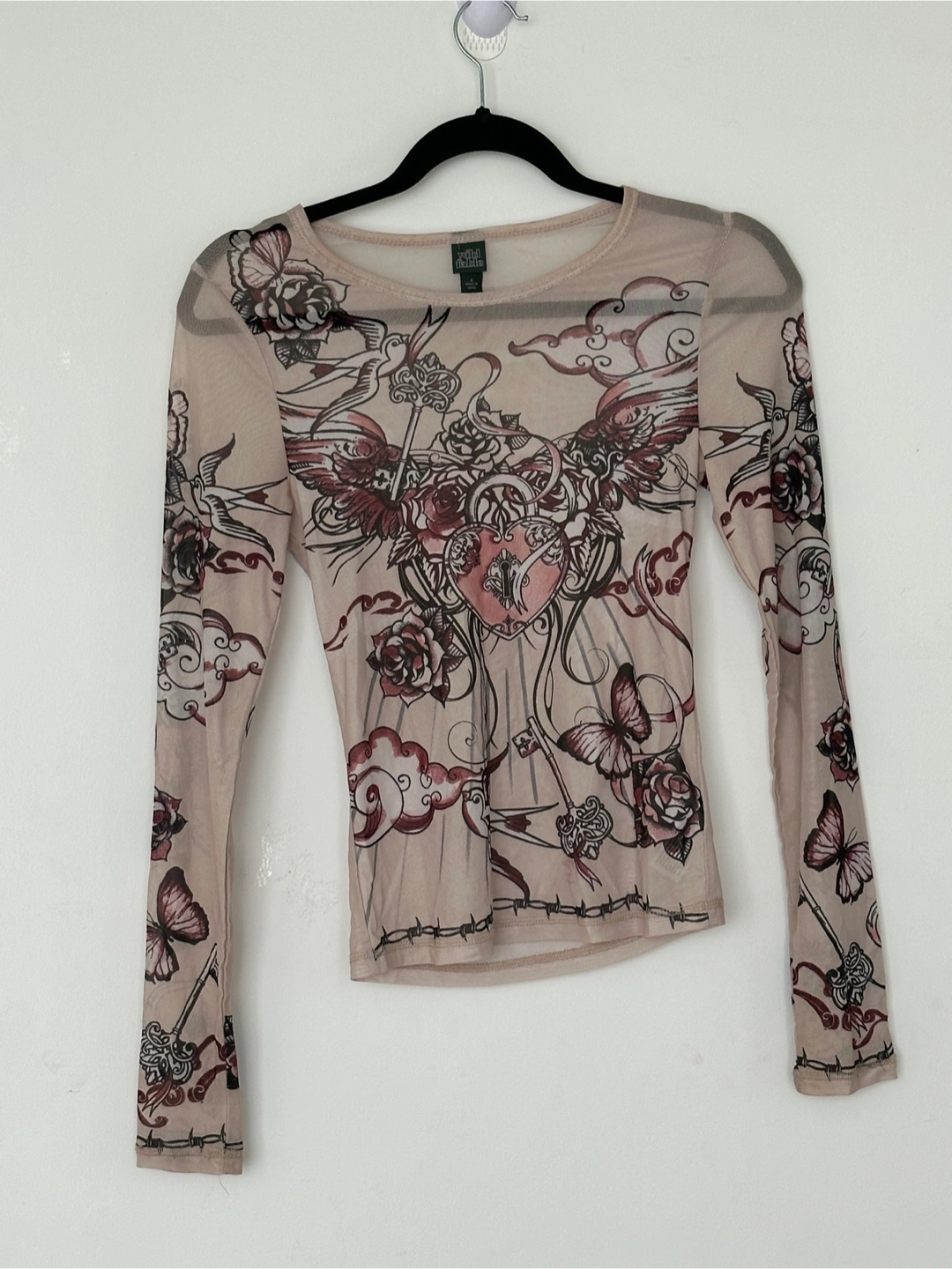 Wild Fable long sleeve top in size small! The shirt is a beige colour with a graphic print featuring roses, butterflies, and a heart with wings.