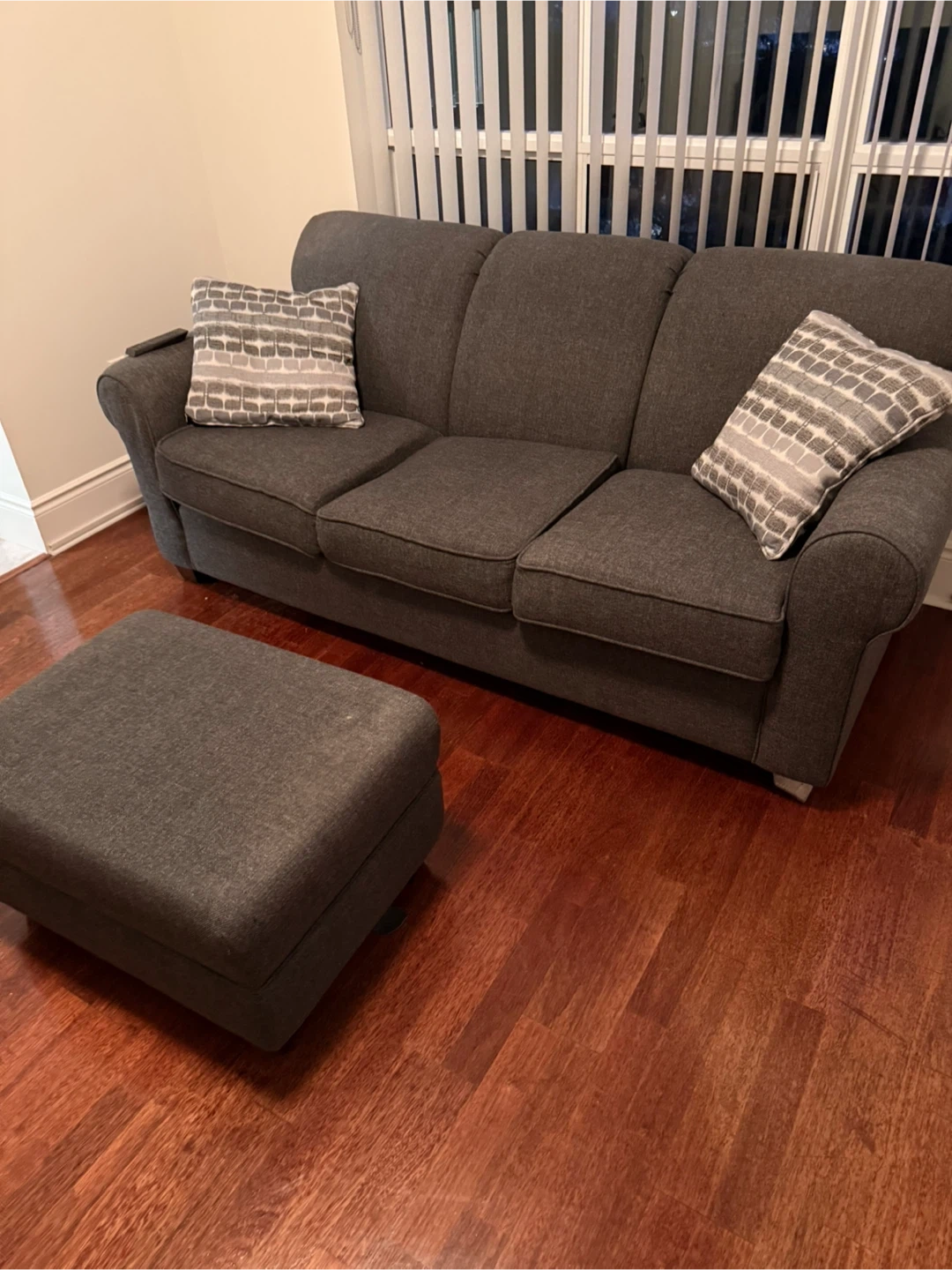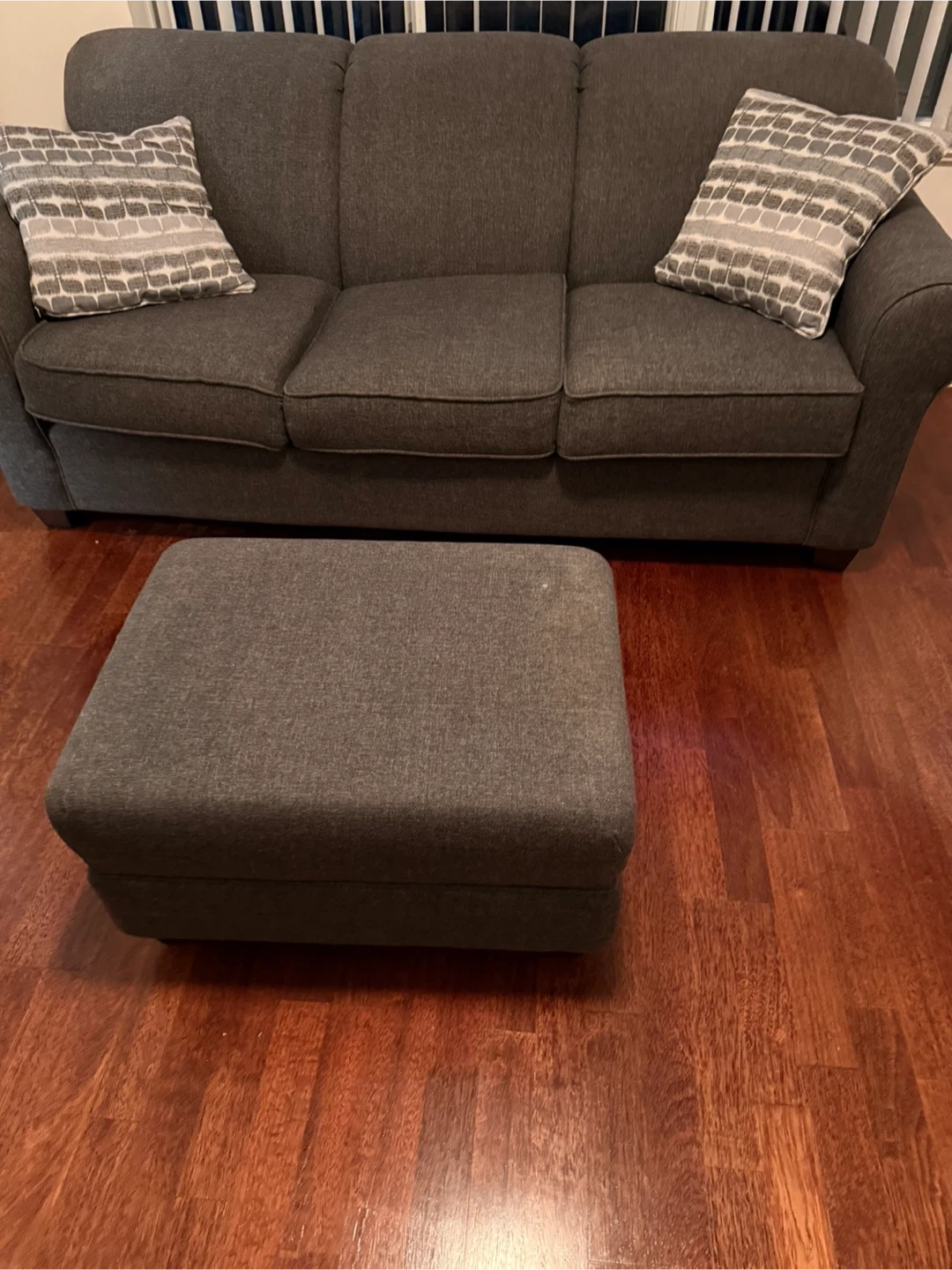 Dark grey fabric sofa with three seat cushions and matching ottoman. Includes two decorative throw pillows. Good condition!