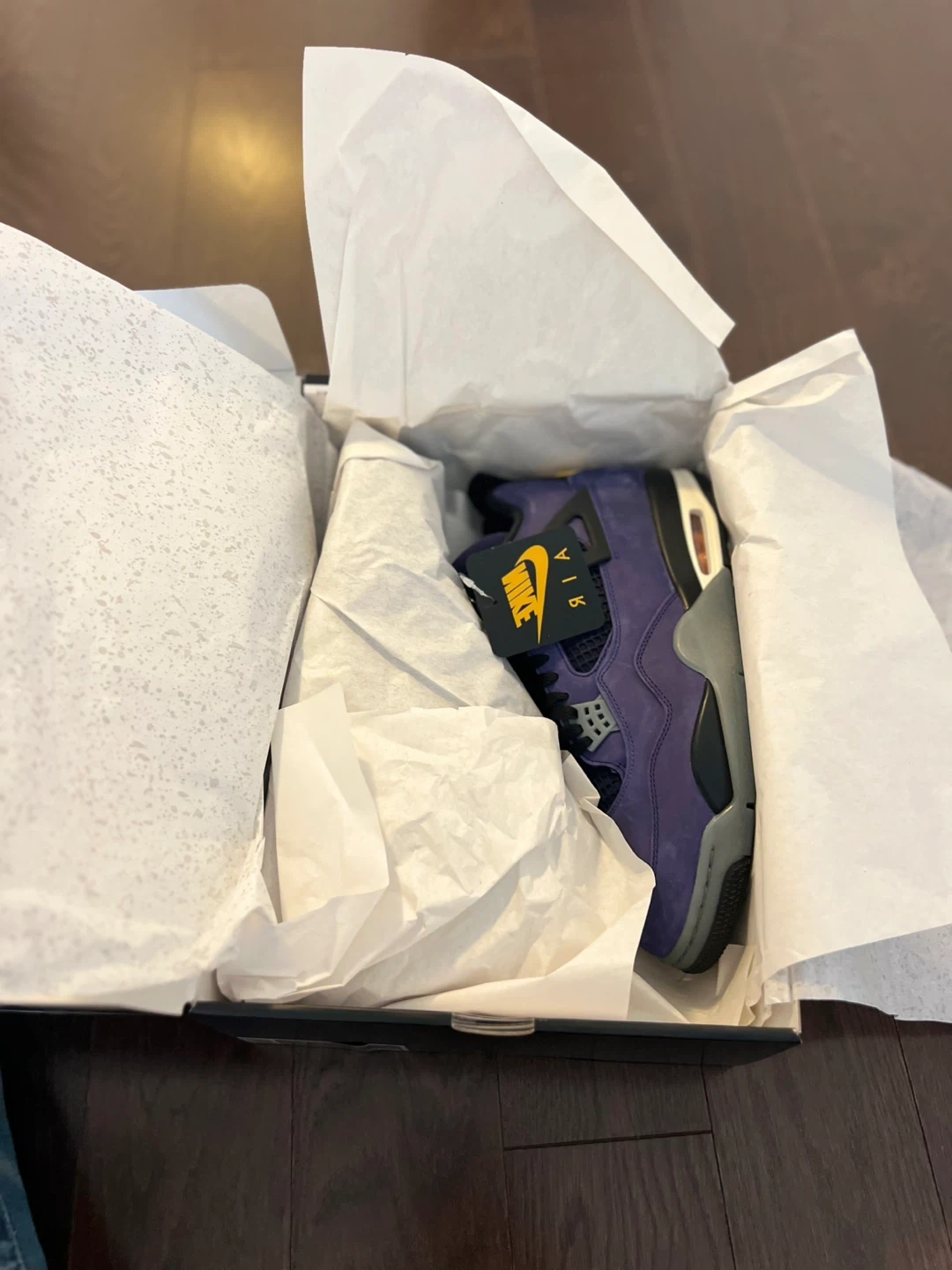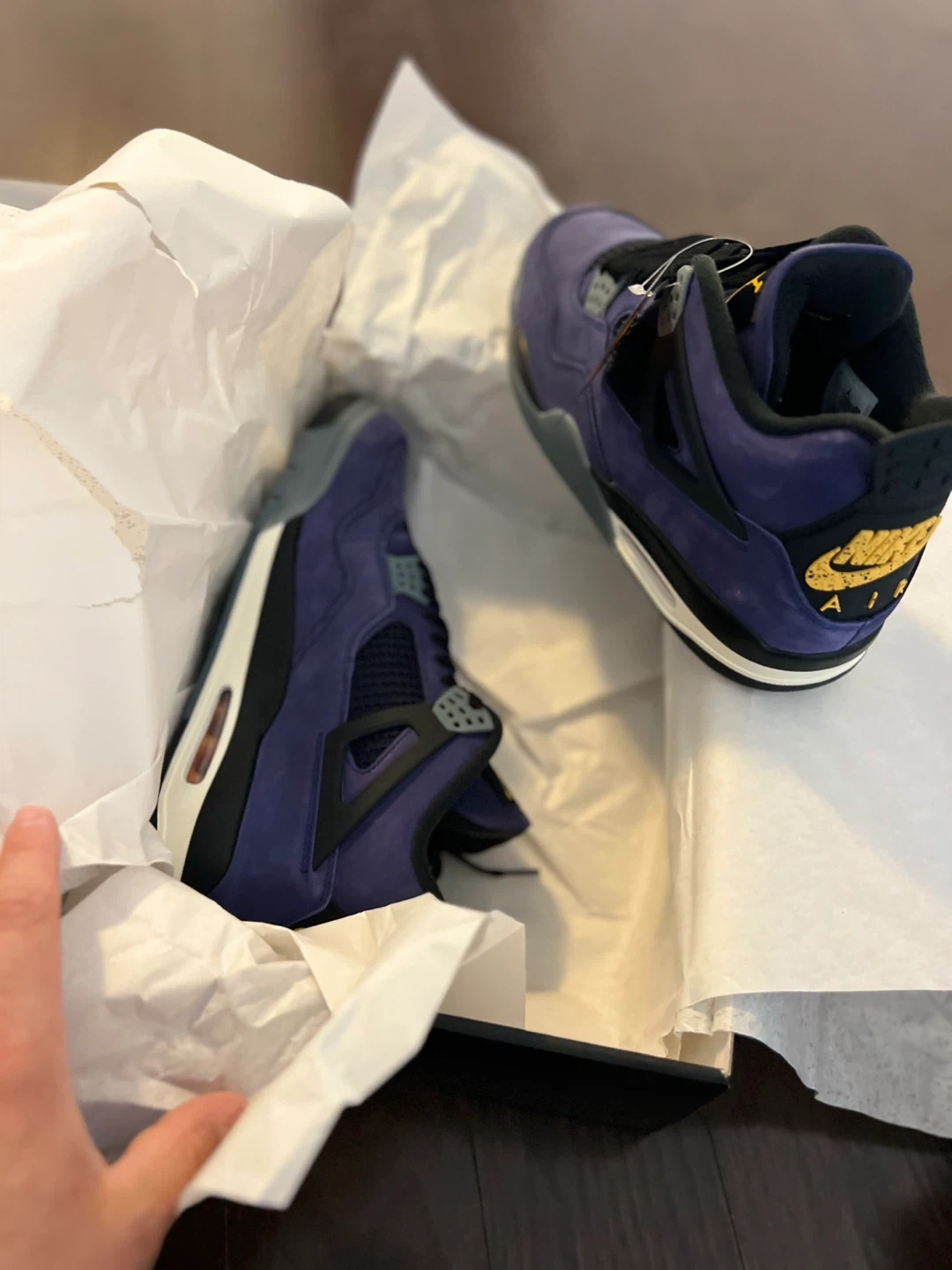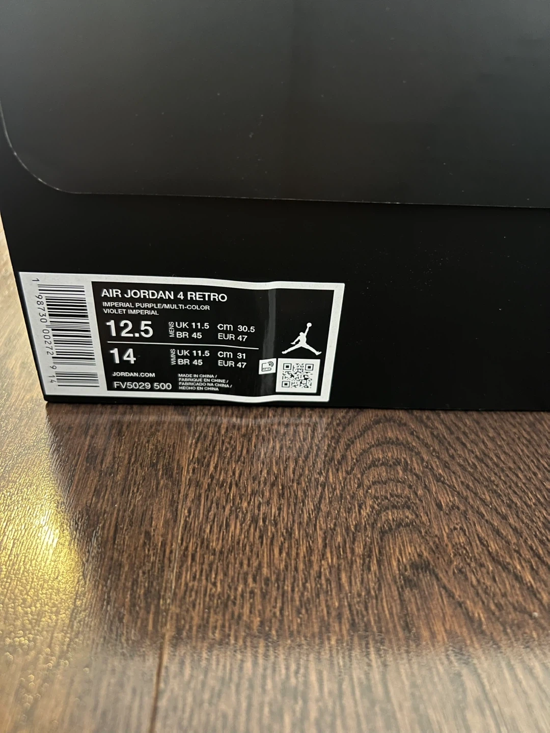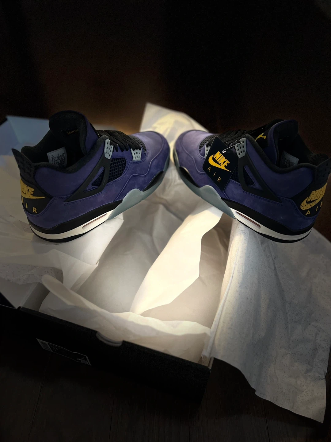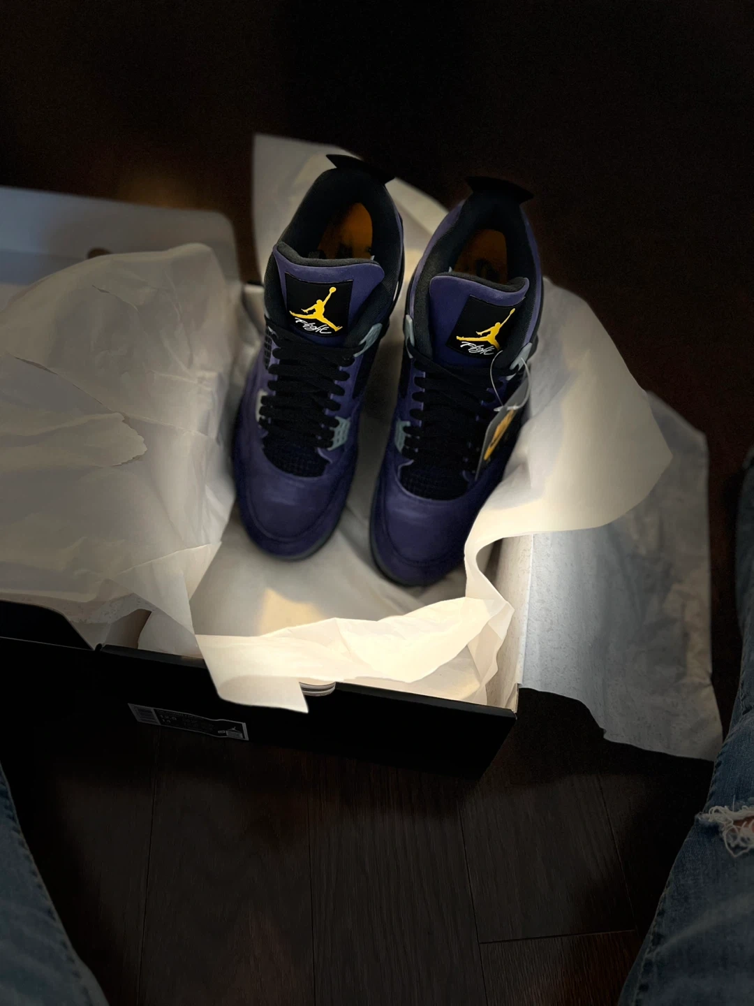 These are a pair of Air Jordan 4 sneakers in an Imperial lakers purple. They feature a premium suede and leather construction with signature 'Flight' and 'Air' branding. Includes original box and packaging.