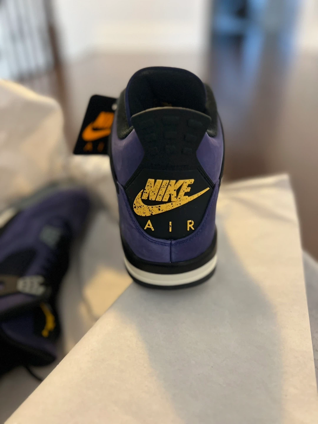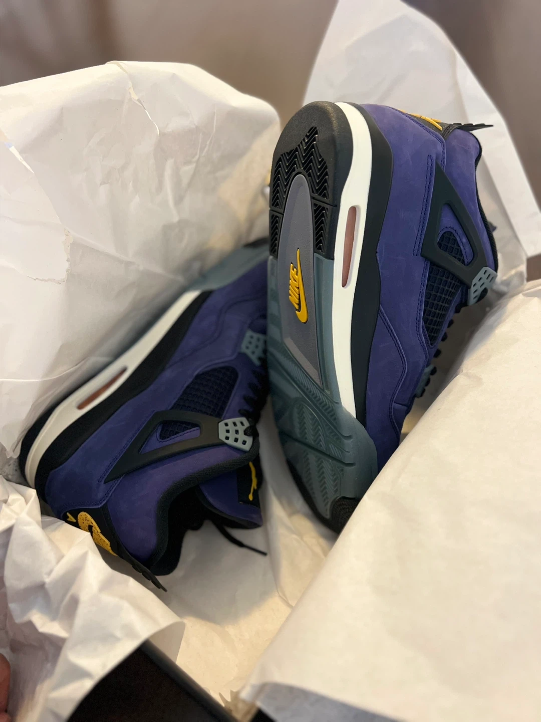 These are a pair of Air Jordan 4 sneakers in an Imperial lakers purple. They feature a premium suede and leather construction with signature 'Flight' and 'Air' branding. Includes original box and packaging.