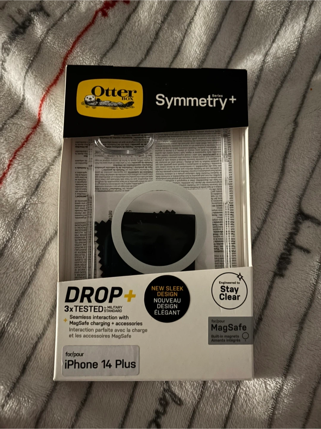 Selling a clear OtterBox Symmetry+ case for the iPhone 14 Plus! It features a sleek design and seamless interaction with MagSafe charging and accessories. The case is drop tested to 3X military standard and has built-in magnets to stay clear!