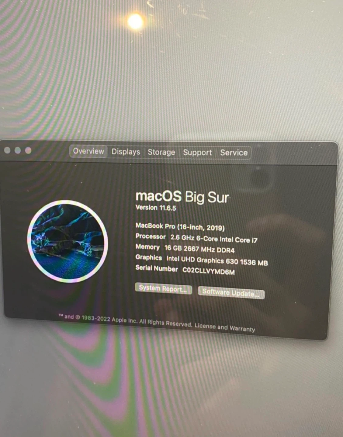 This is a 2019 MacBook Pro with a 16-inch display. It's powered by a 2.6 GHz 6-Core Intel Core i7 processor and has 16 GB of DDR4 memory. It comes with 500 GB of flash storage. This laptop runs macOS Big Sur version 11.6.5.
