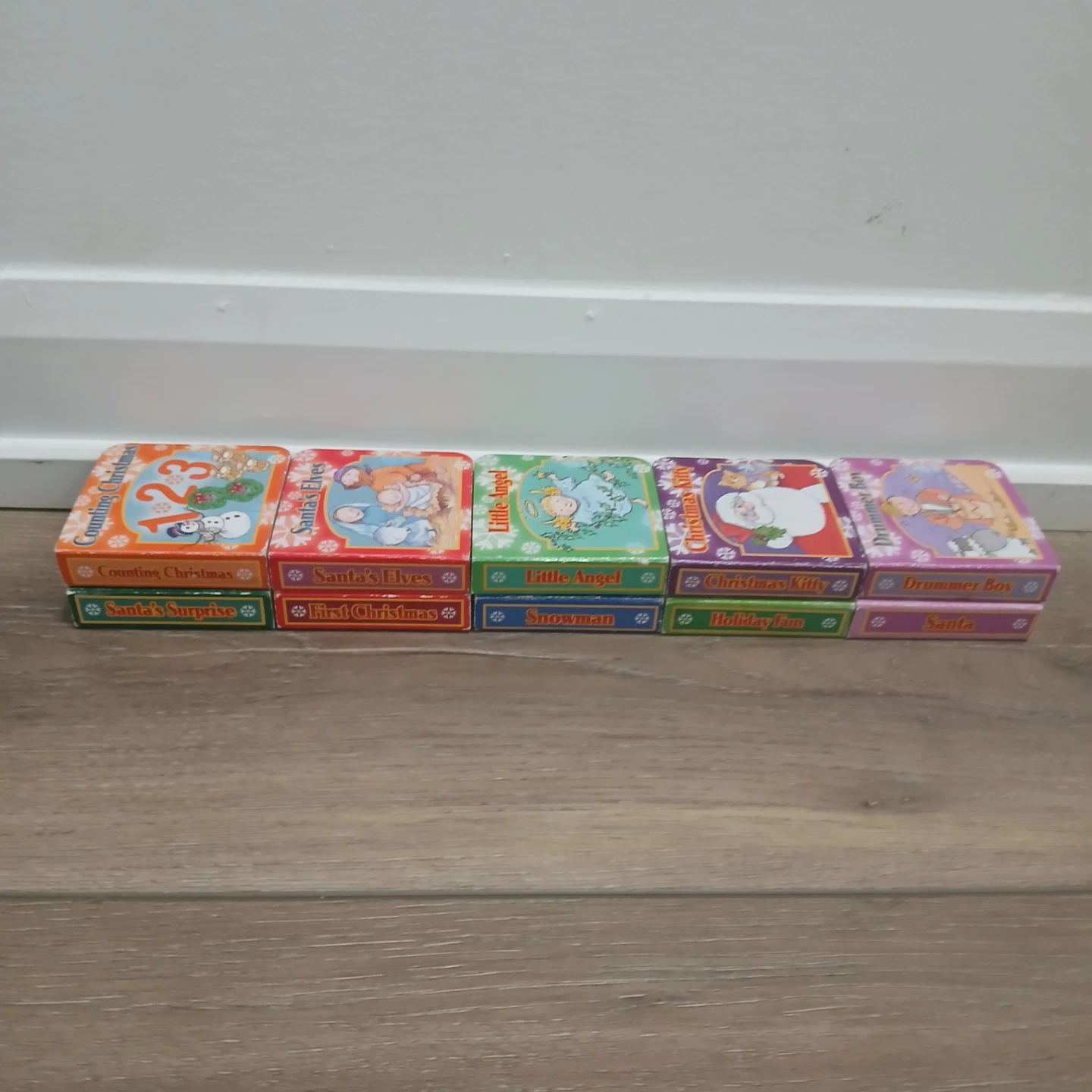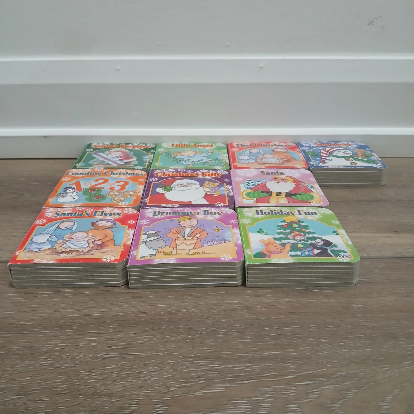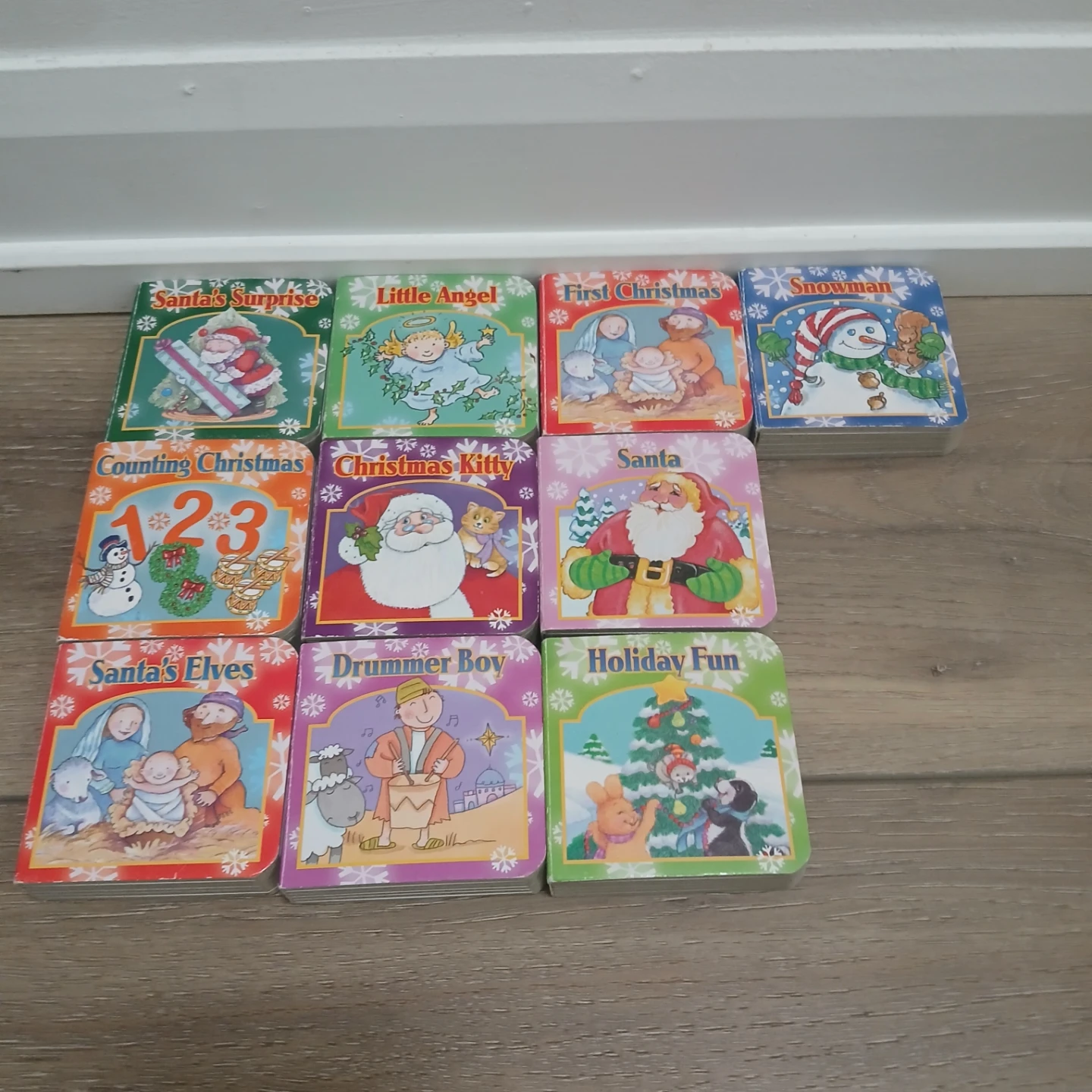 This is a collection of 10 charming board books, each with a unique Christmas theme. Titles include 'Santa's Surprise,' 'Little Angel,' 'First Christmas,' 'Snowman,' 'Counting Christmas,' 'Christmas Kitty,' 'Santa,' 'Santa's Elves,' 'Drummer Boy,' and 'Holiday Fun.' These books are perfect for little ones to enjoy festive stories during the holiday season.