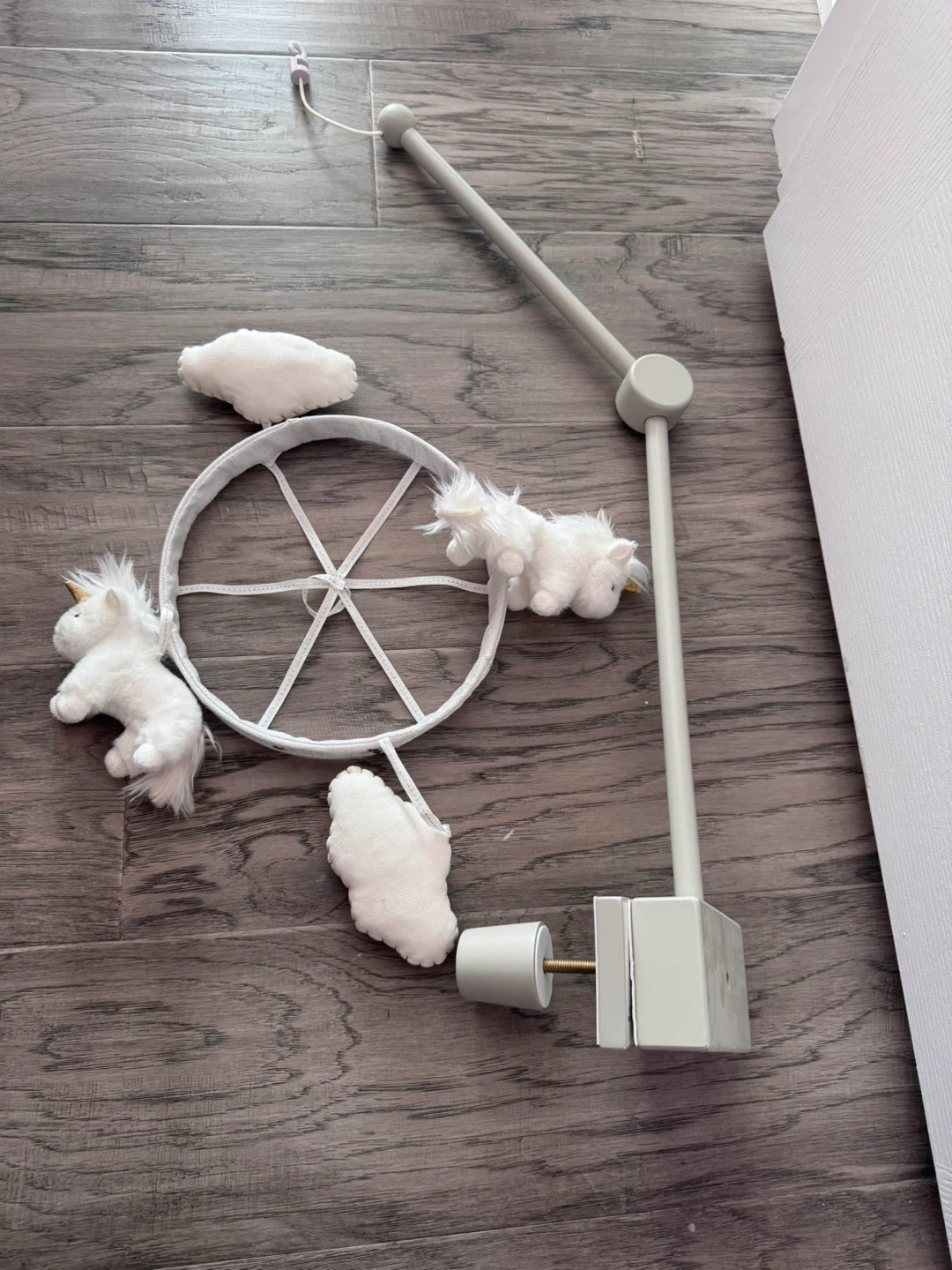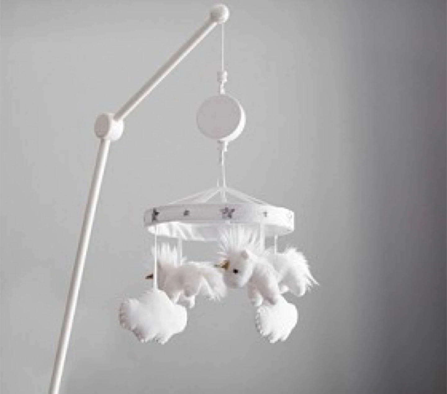 This is a white baby mobile featuring plush unicorns and clouds. It's designed to attach to a crib. It includes the mobile arm, the ring with characters, and the mounting piece.
