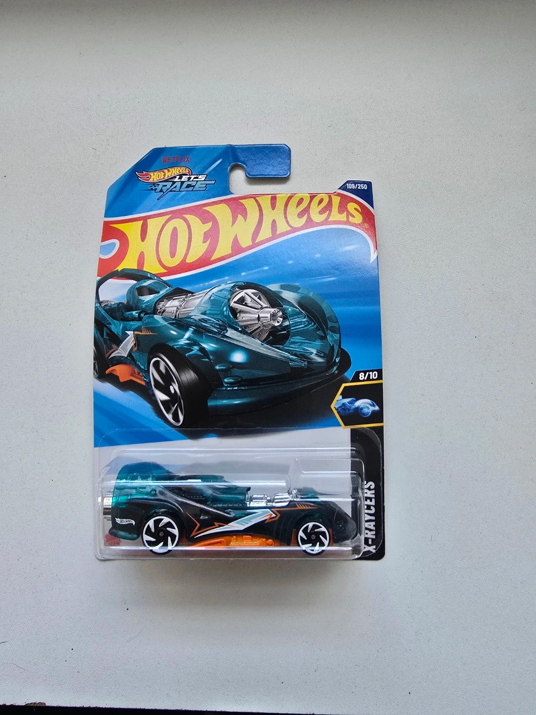 This is a Hot Wheels X-Raycers die-cast toy car. It's part of the 2023 collection and is the 8/10 in its series. The car features a translucent green body with orange and black accents.