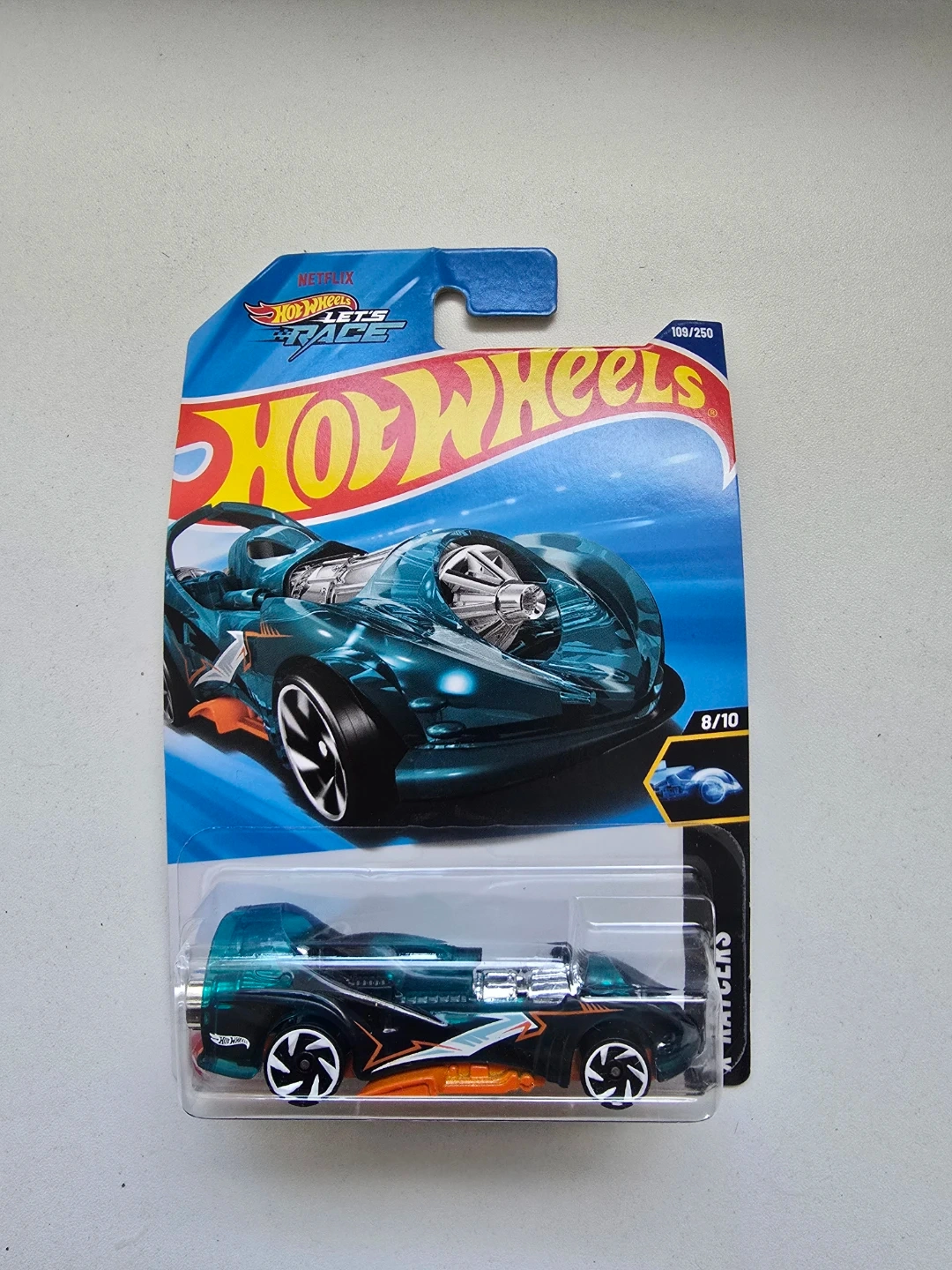 This is a Hot Wheels X-Raycers die-cast toy car. It's part of the 2023 collection and is the 8/10 in its series. The car features a translucent green body with orange and black accents.