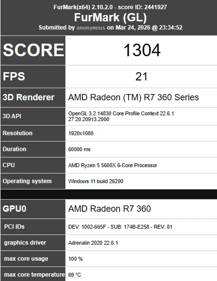 It worked well and the fan was spinning and I took it apart to service it, as it was dusty and I repasted it, cleaned out the fins and heatsink, the shroud, and the fan. it made a rattling noise while running it, but it did run. The last 2 pictures are benchmarks. The hottest it got when the fan worked was 66° C at 100% utilization.