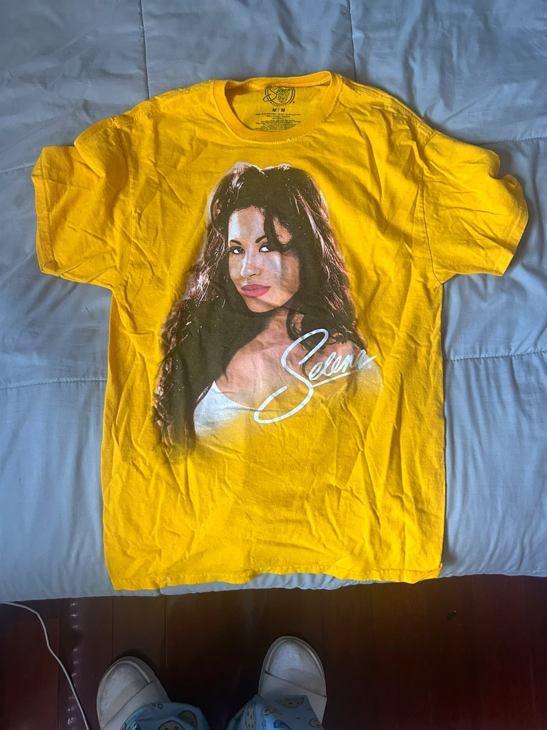 This is a yellow t-shirt featuring a graphic of Selena Quintanilla. It's made of 100% cotton and is a size M/M. Care instructions include machine wash cold with like colors and tumble dry low.
