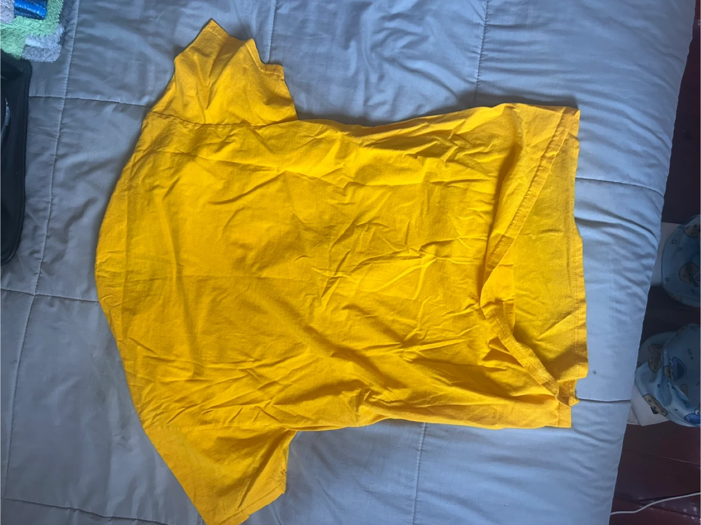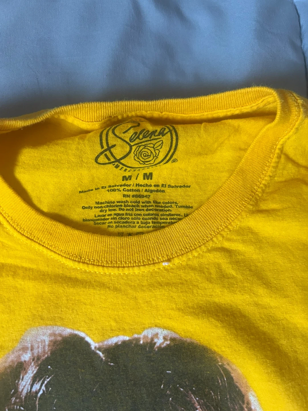 This is a yellow t-shirt featuring a graphic of Selena Quintanilla. It's made of 100% cotton and is a size M/M. Care instructions include machine wash cold with like colors and tumble dry low.