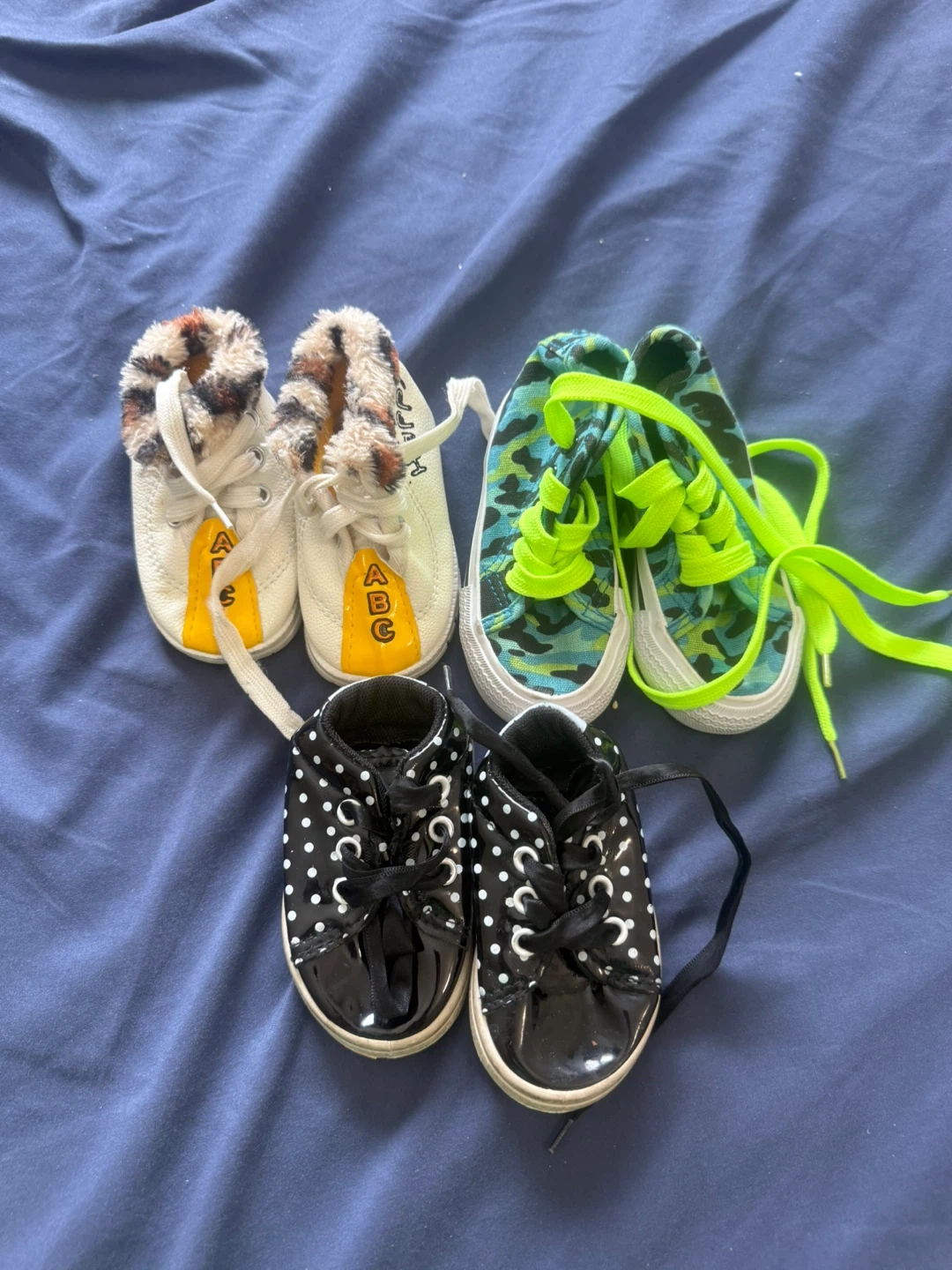 This lot includes tree pairs of children's shoes. Two pairs are white with fuzzy trim and colourful patches, one with 'A', 'B', 'C' on the tongues. Another pair features a green and blue camouflage pattern with bright green laces. The final pair is black with a white polka dot design. They're all low-top sneakers.