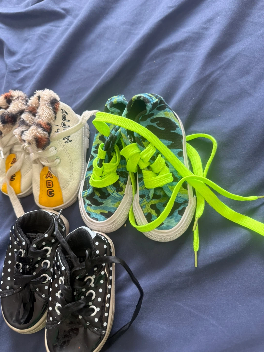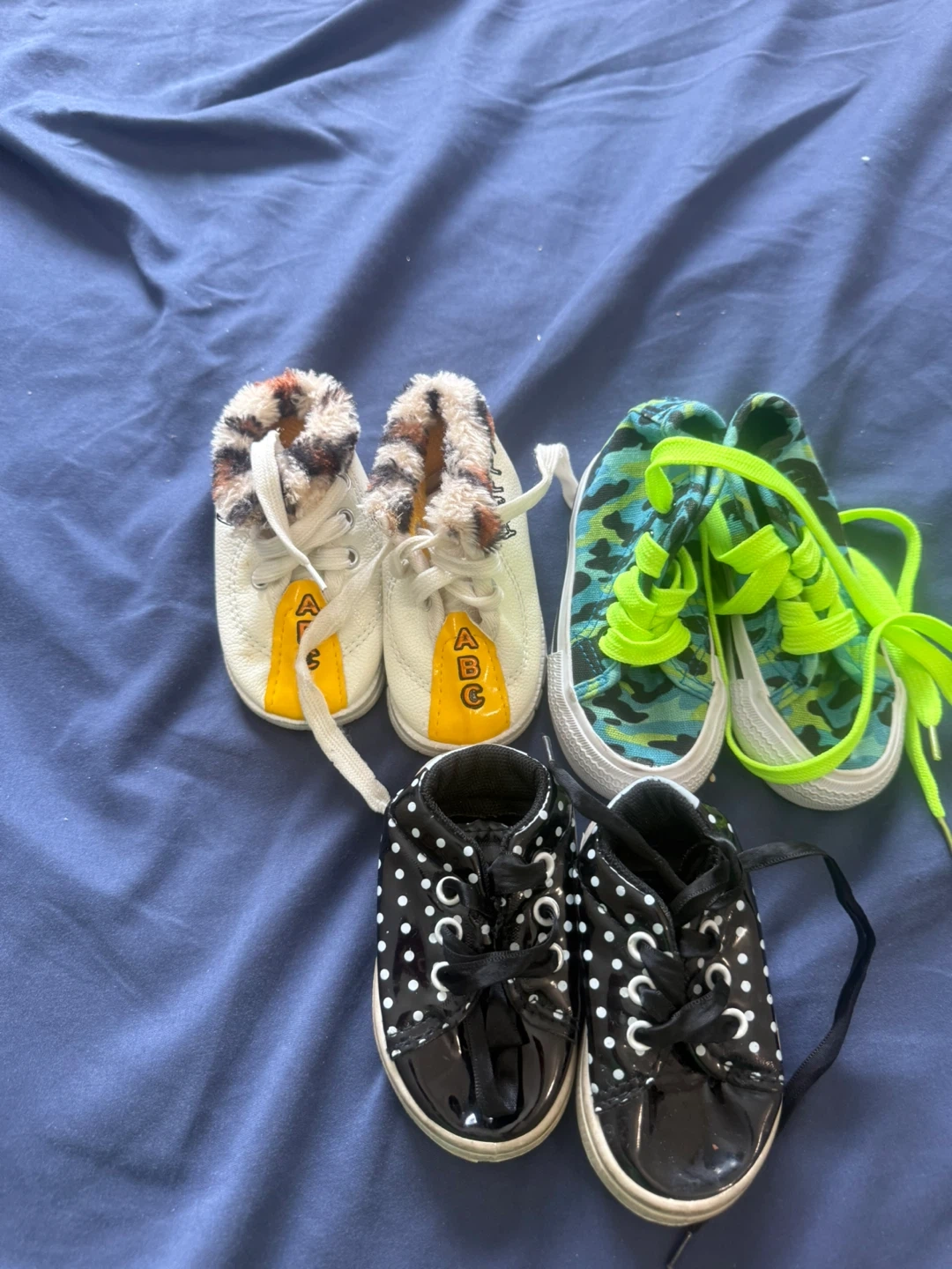This lot includes tree pairs of children's shoes. Two pairs are white with fuzzy trim and colourful patches, one with 'A', 'B', 'C' on the tongues. Another pair features a green and blue camouflage pattern with bright green laces. The final pair is black with a white polka dot design. They're all low-top sneakers.