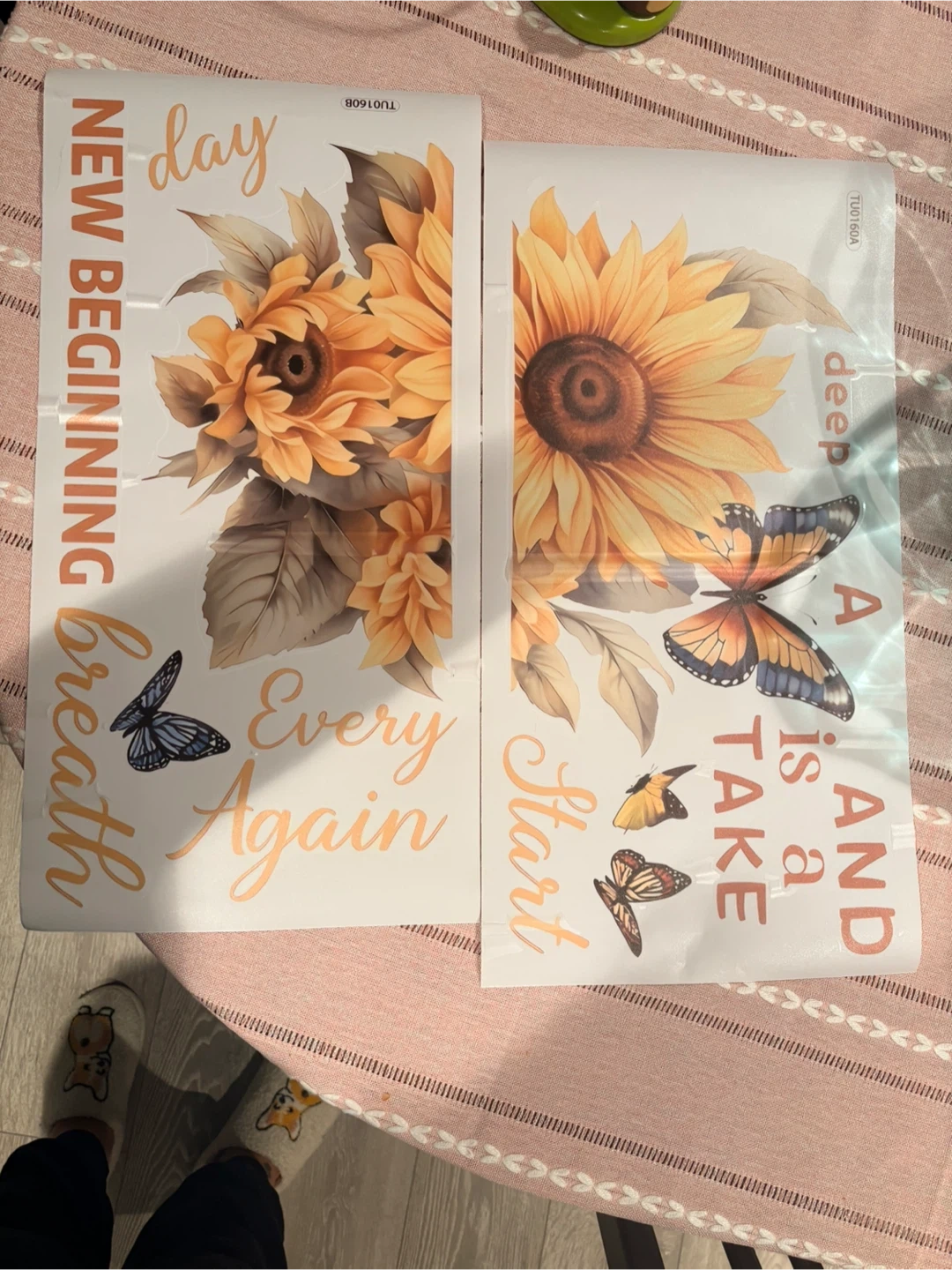 These decorative stickers feature sunflowers and butterflies with an inspirational quote. "Every day is a new beginning, take a deep breath and start again.". Easy to apply to walls for a cheerful accent. Comes with two sheets of stickers.
