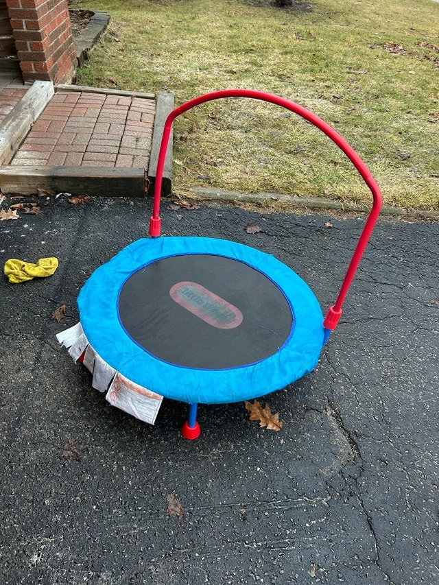 Get ready to bounce with this Little Tikes trampoline, perfect for toddlers and young children to burn off some energy indoors or outdoors! This trampoline has seen some action. It's in used condition, but still offers plenty of fun and safe bouncing. The safety bar provides extra stability for little ones as they jump. Brand: Little Tikes. Weight Limit: Up to 55 lbs. Recommended Age: 3-6 years. Cash accepted.