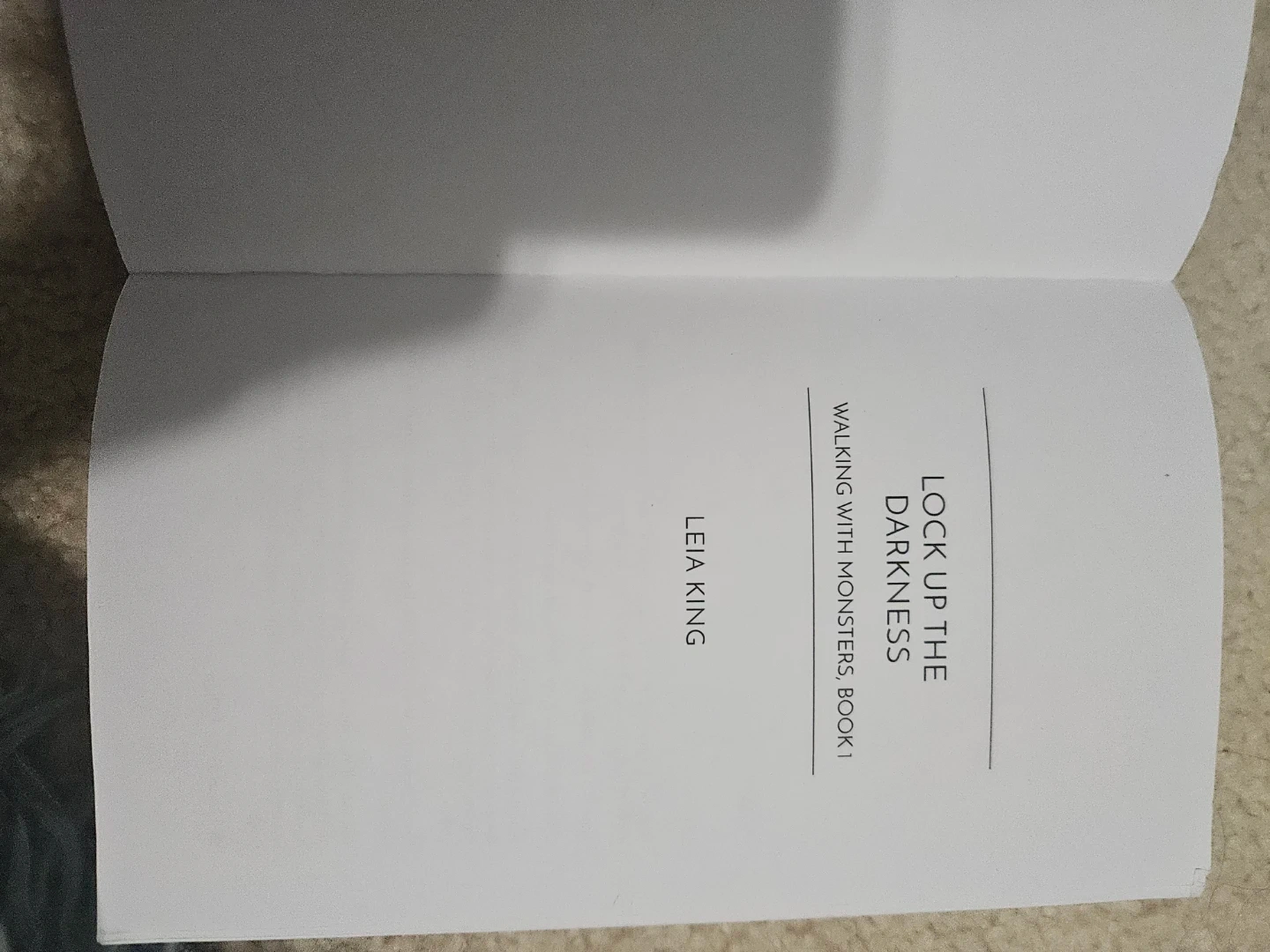 This paperback book is titled "Lock Up The Darkness" and is "Book One" in the "Walking With Monsters" series. It's written by Leia King. The story is set in the town of Hexwood and follows a protagonist investigating their father's disappearance.