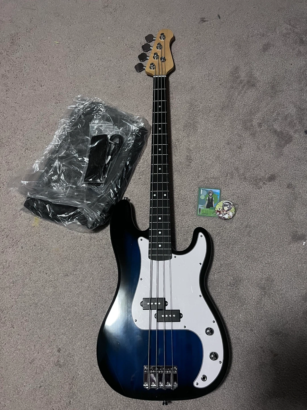 This electric bass guitar is a vibrant blue with a white pickguard. It includes a gig bag and charging cable. It's a standard 4-string model. This bass is great for beginners looking to learn. Used only like twice and E transfer accpected too ‼️need gone ASAP‼️ Lowest price i can take is $120!!