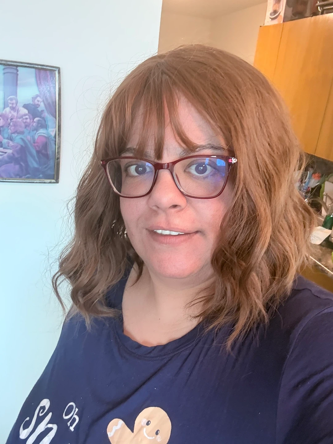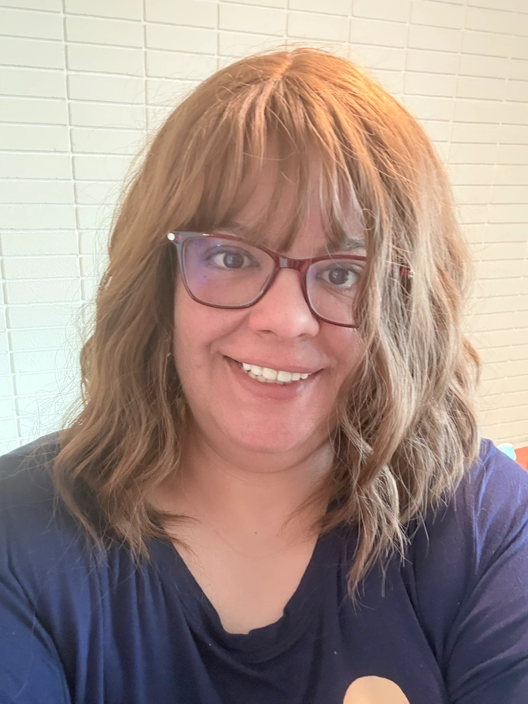 This is a shoulder-length, wavy brown wig with bangs. It has a natural look and feel, perfect for everyday wear or special occasions. The adjustable cap ensures a comfortable and secure fit.