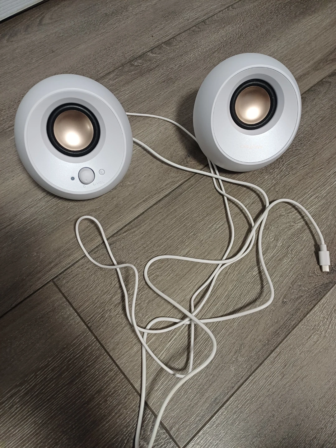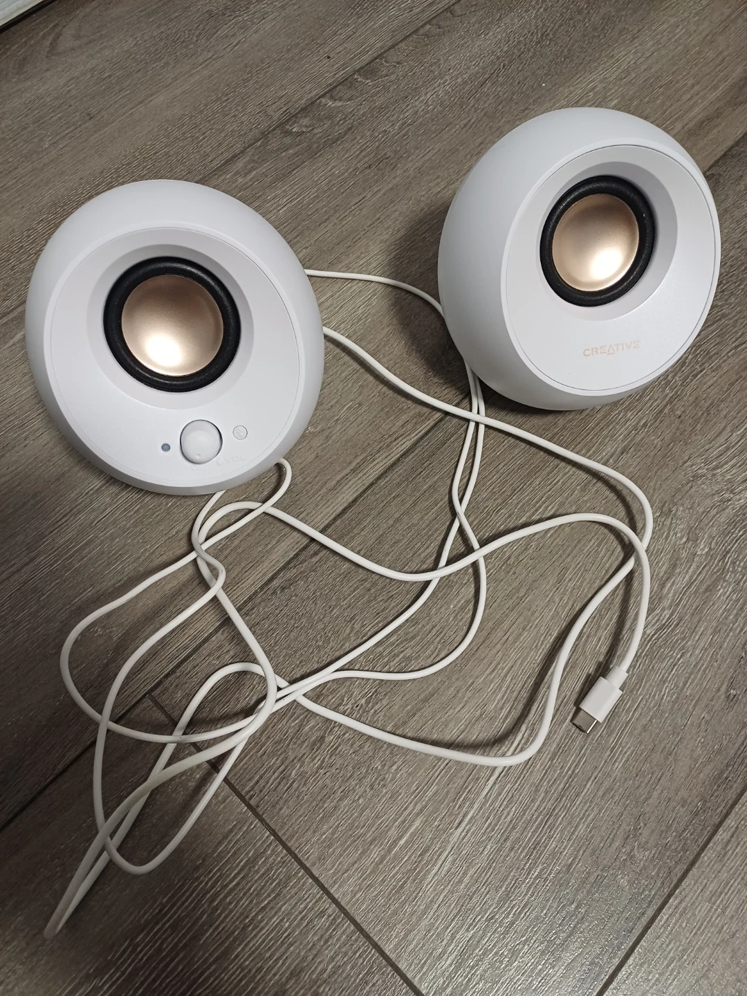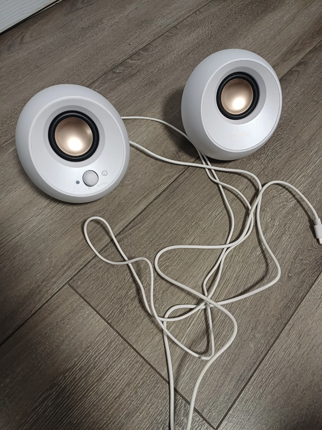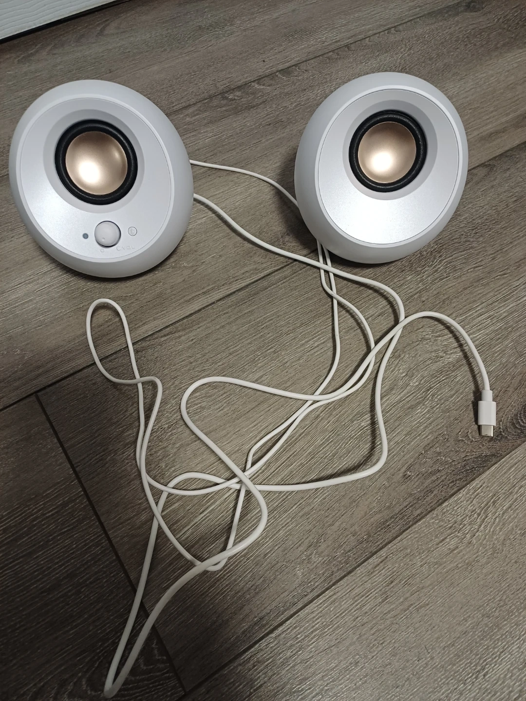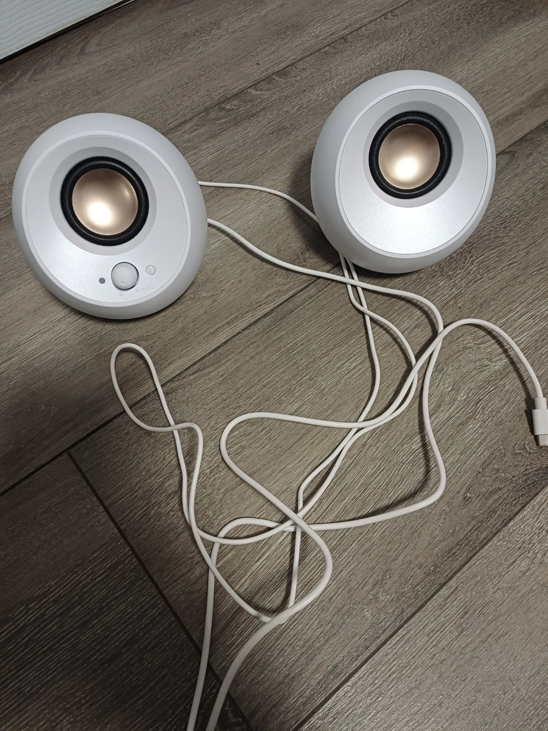 Selling a creative pebble 2.0 USB powered compact desktop speakers with a modern white finish. They're perfect for upgrading your computer's audio. Includes volume control and a power button.