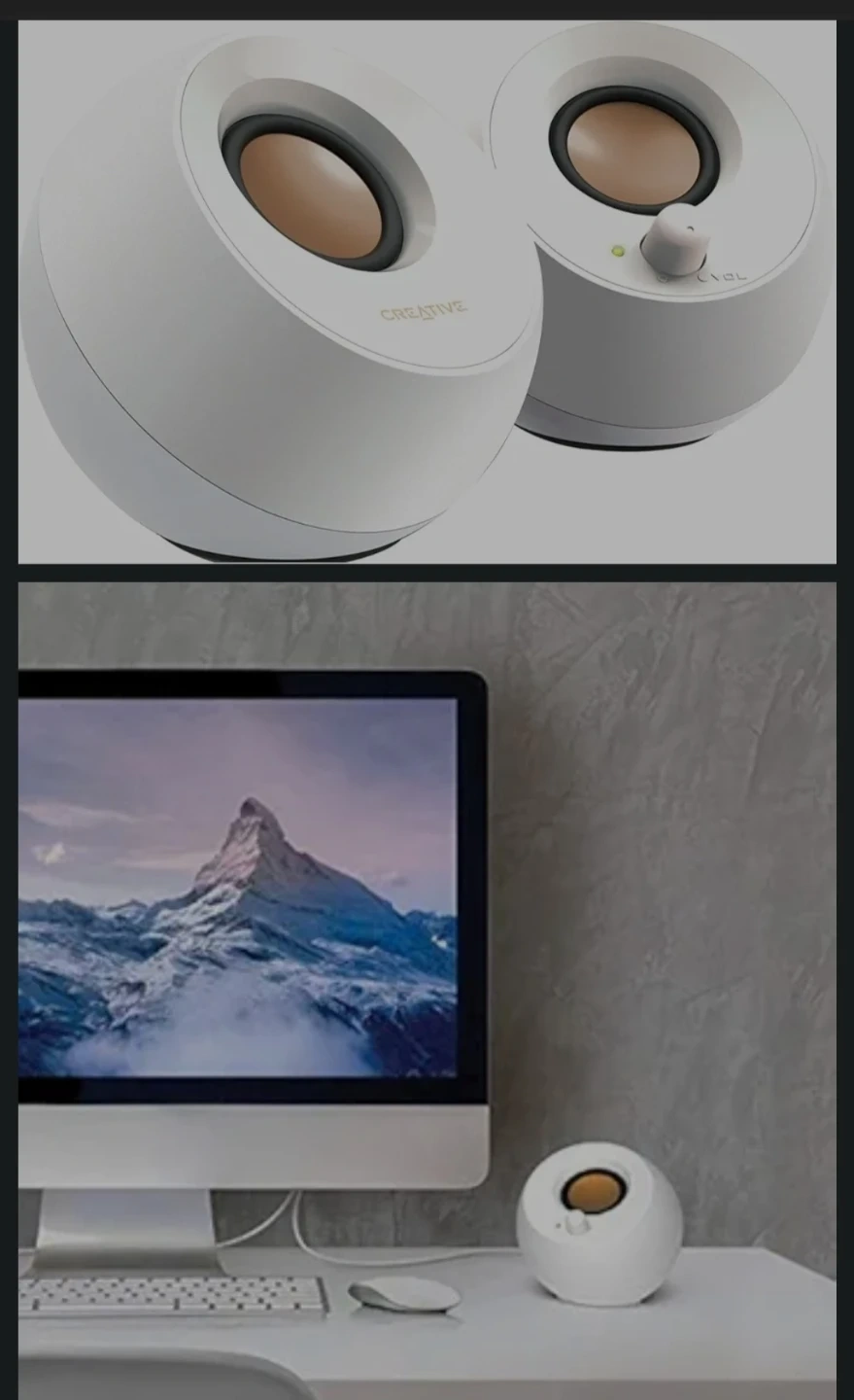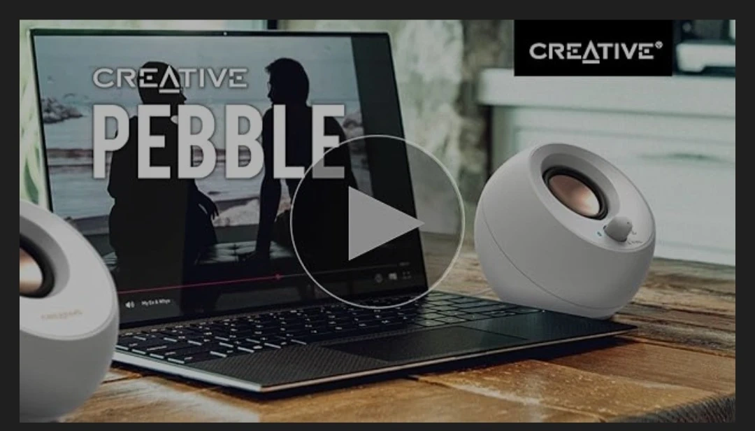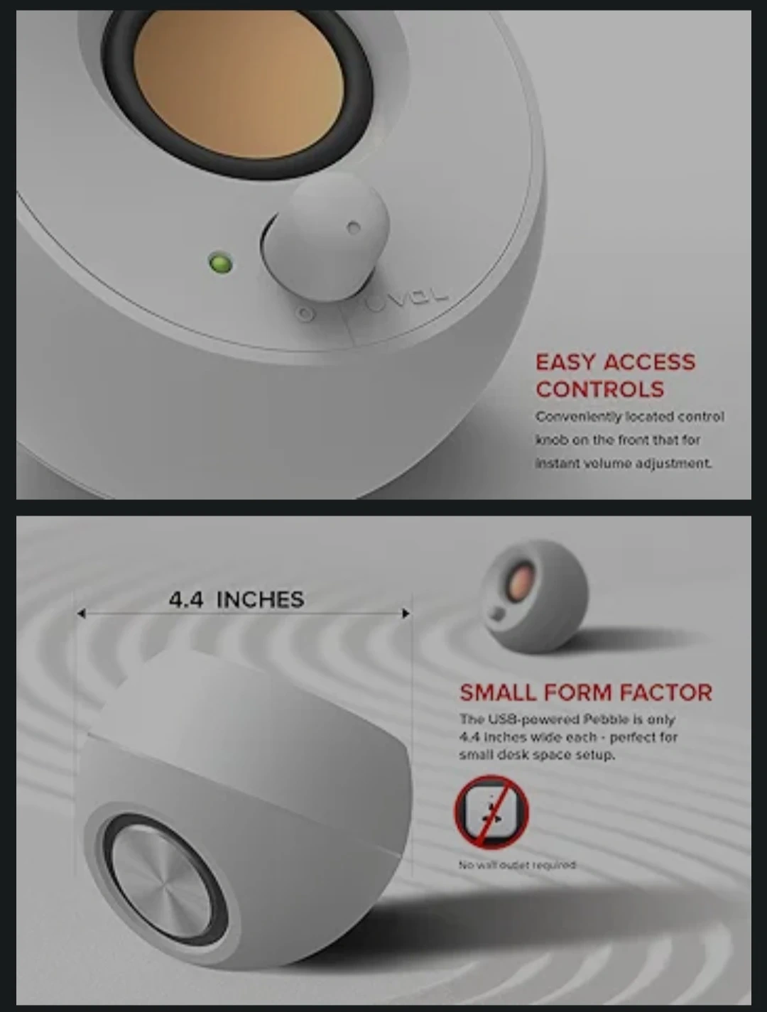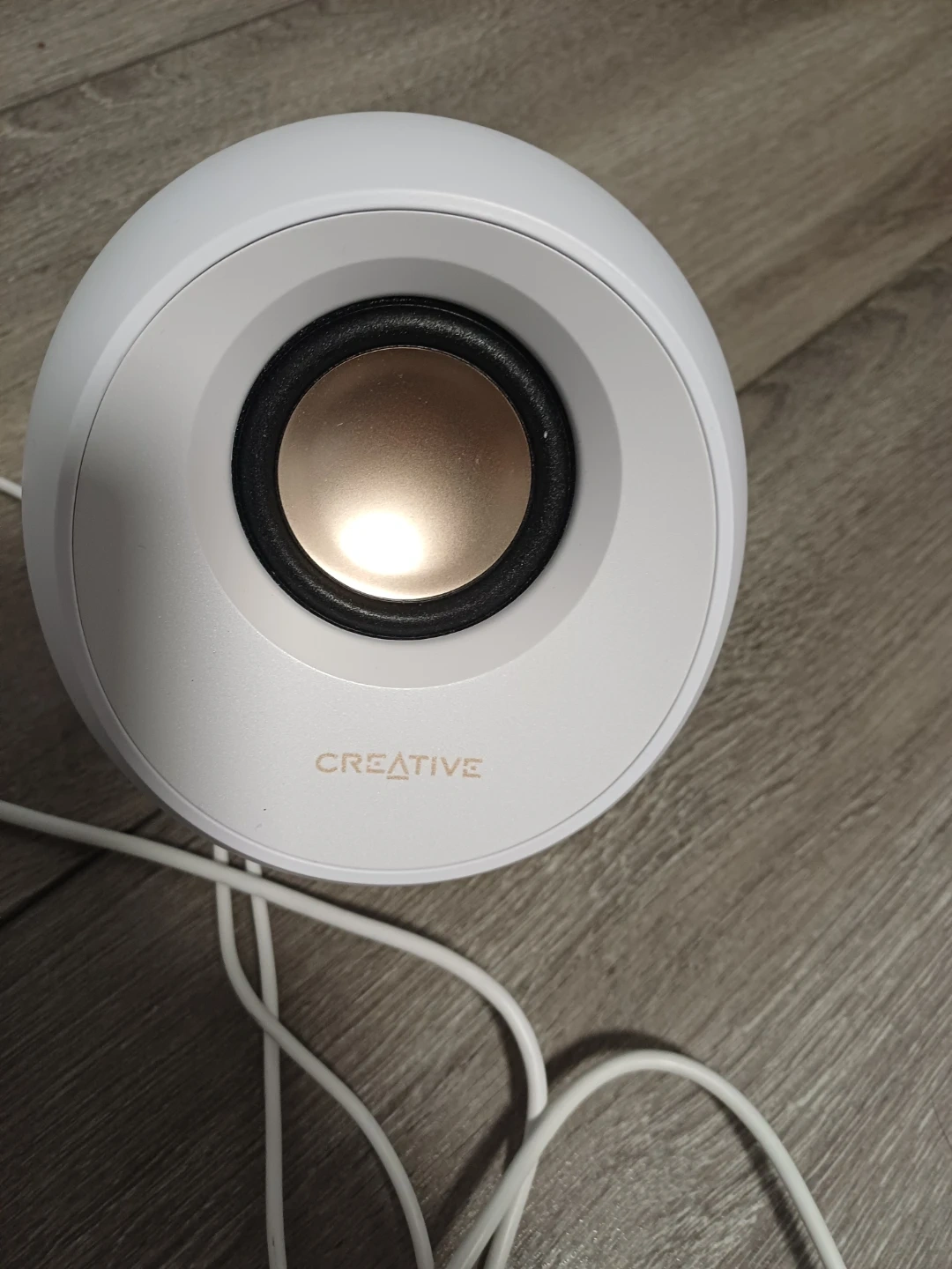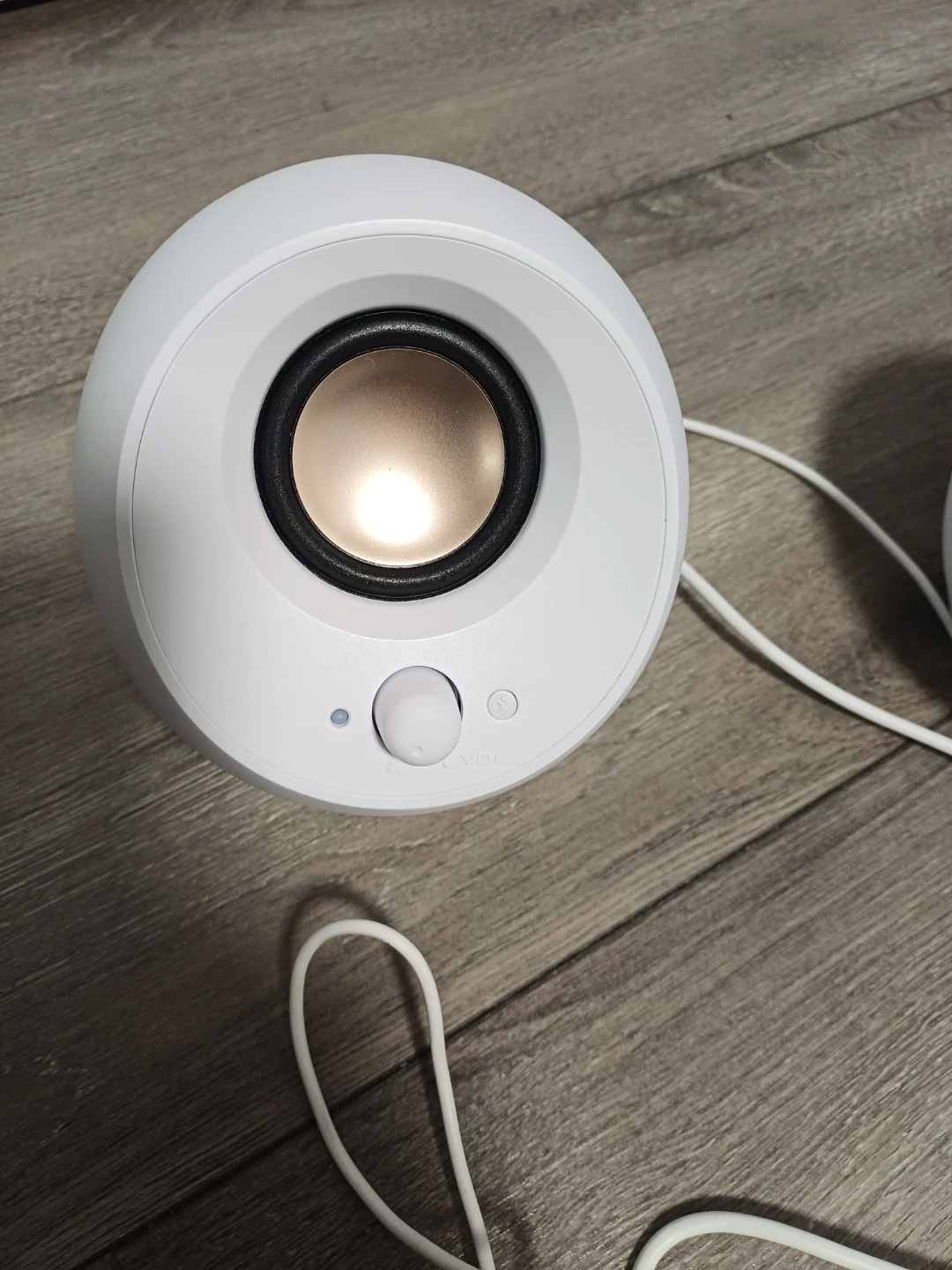 Selling a creative pebble 2.0 USB powered compact desktop speakers with a modern white finish. They're perfect for upgrading your computer's audio. Includes volume control and a power button.