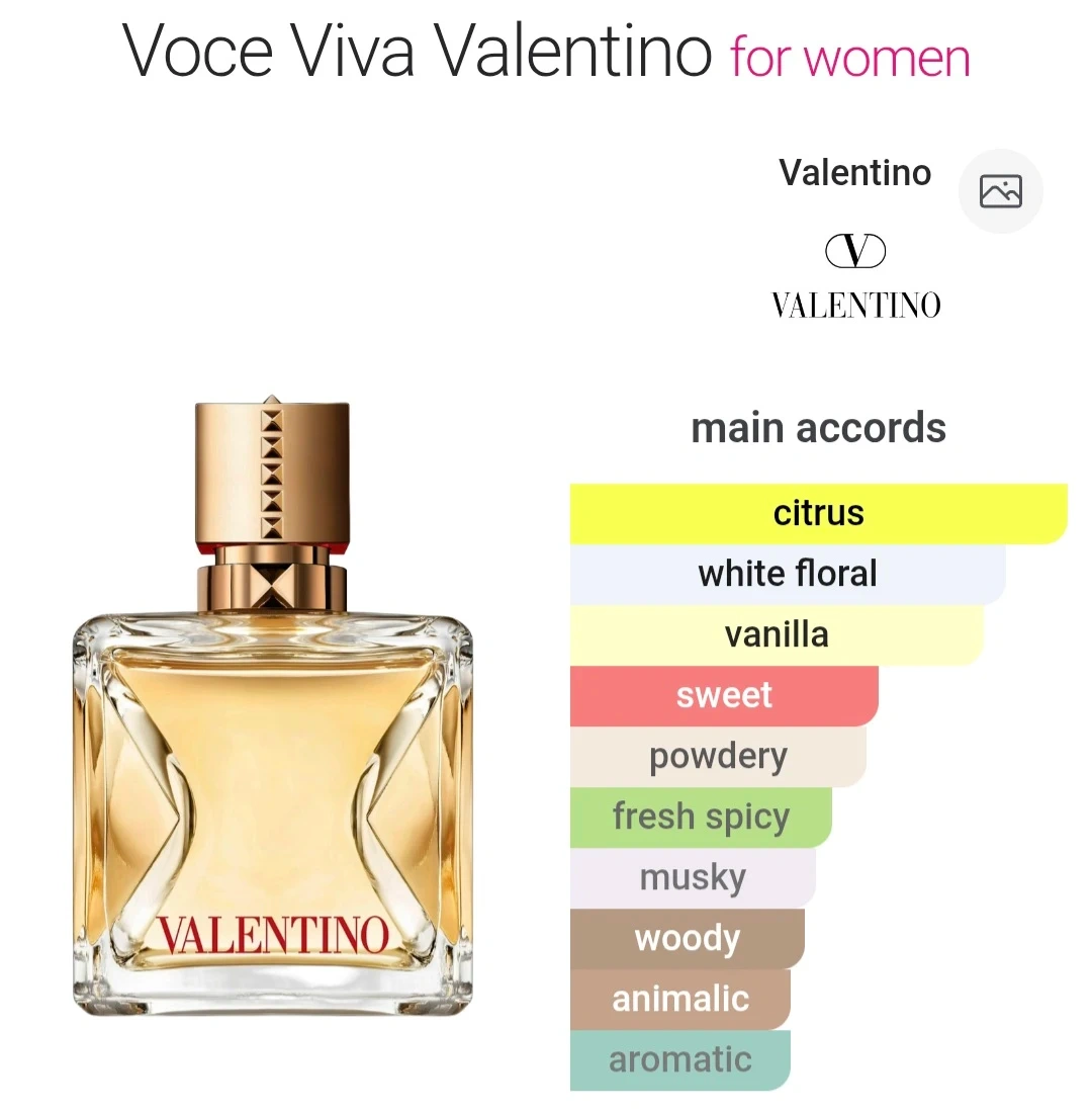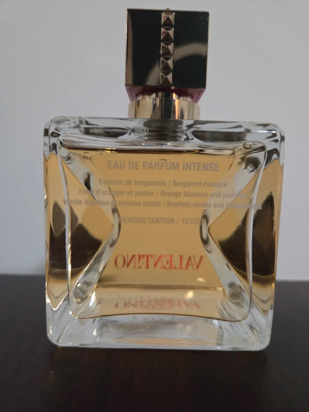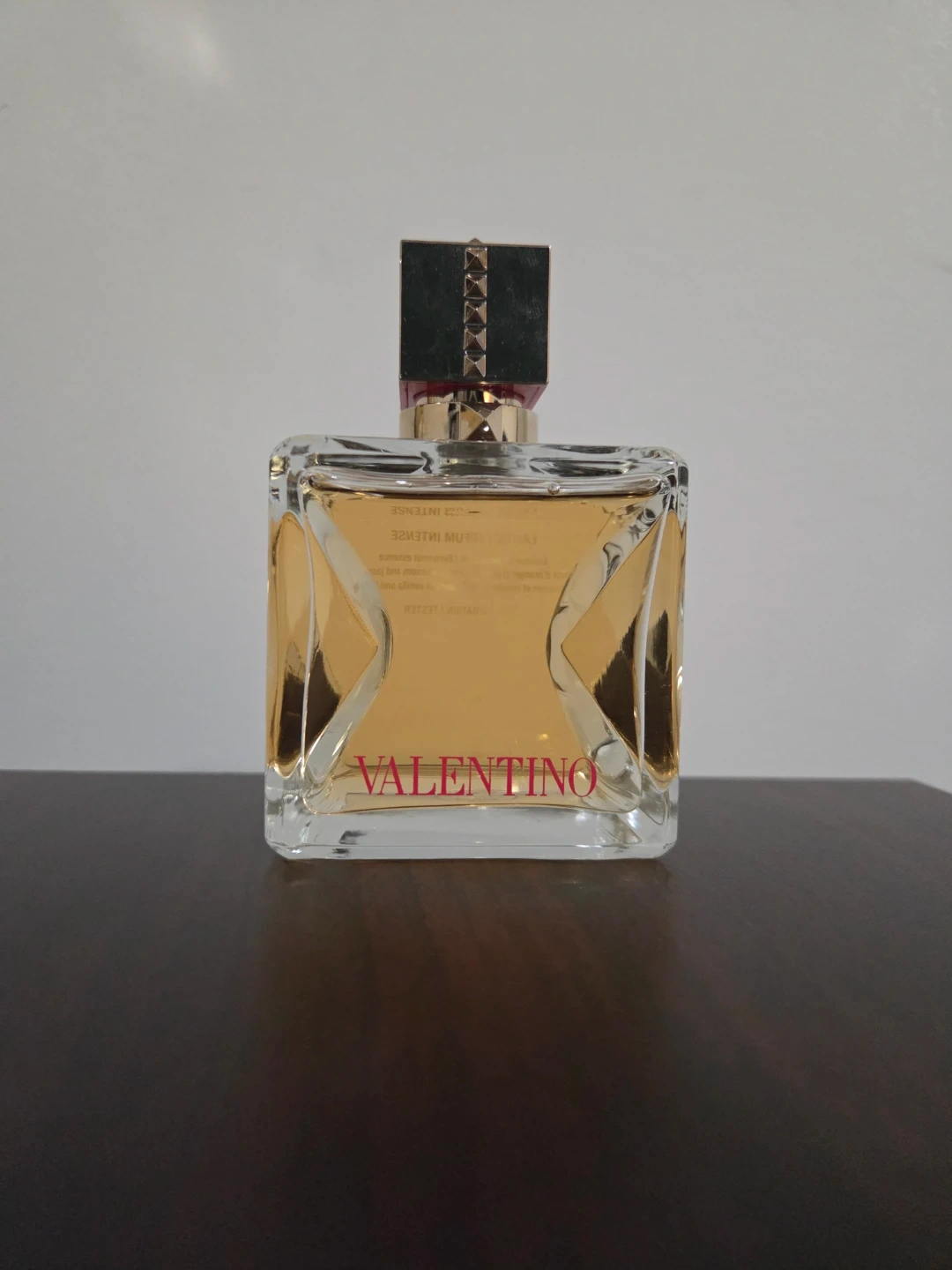 This is a 100mL bottle of Valentino Voce Viva Eau de Parfum Intense. It features notes of bergamot, orange blossom, jasmine, and vanilla bourbon. A fresh spicy and woody scent.