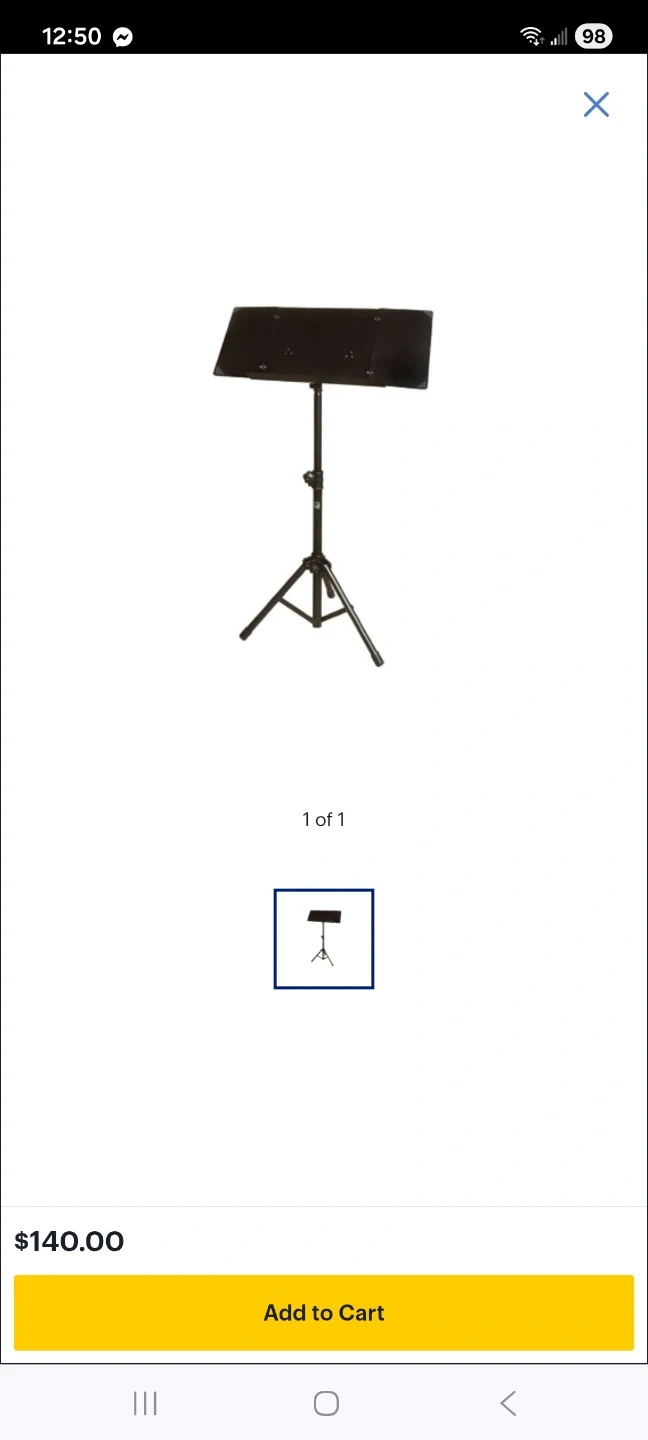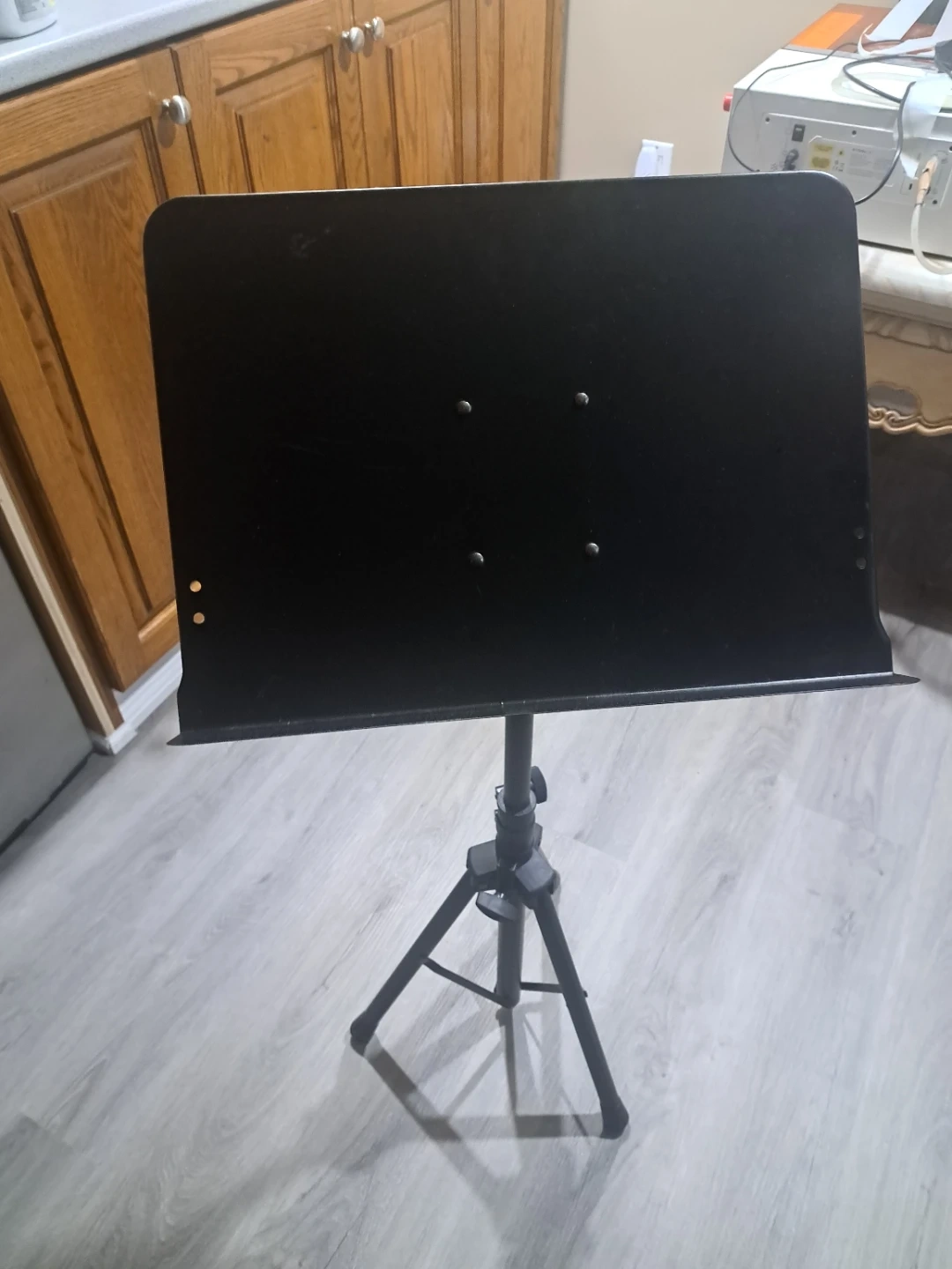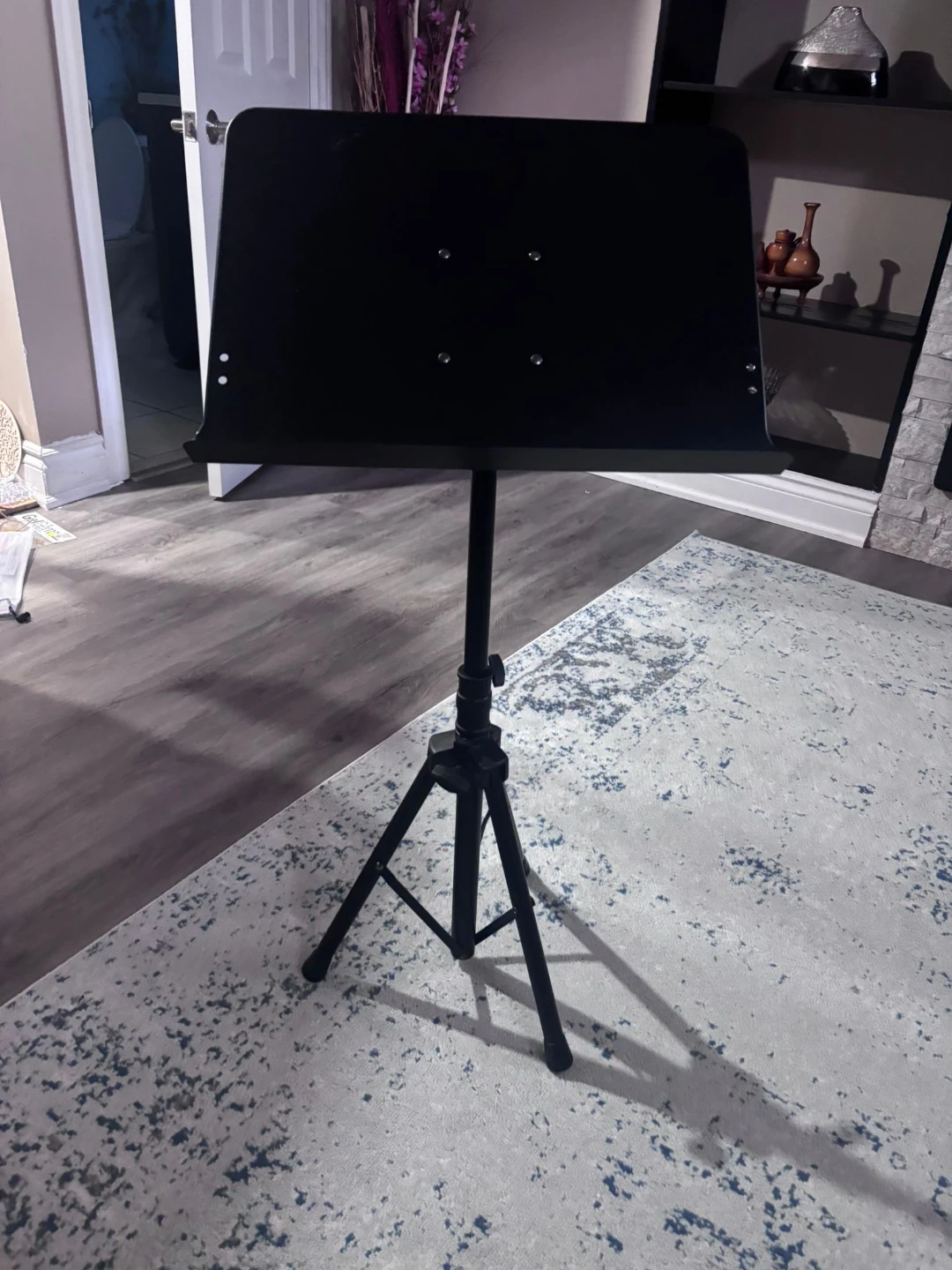 This is a black, folding music stand. It features a sturdy metal construction with a tripod base for stability. The stand is adjustable in height and angle for optimal viewing.