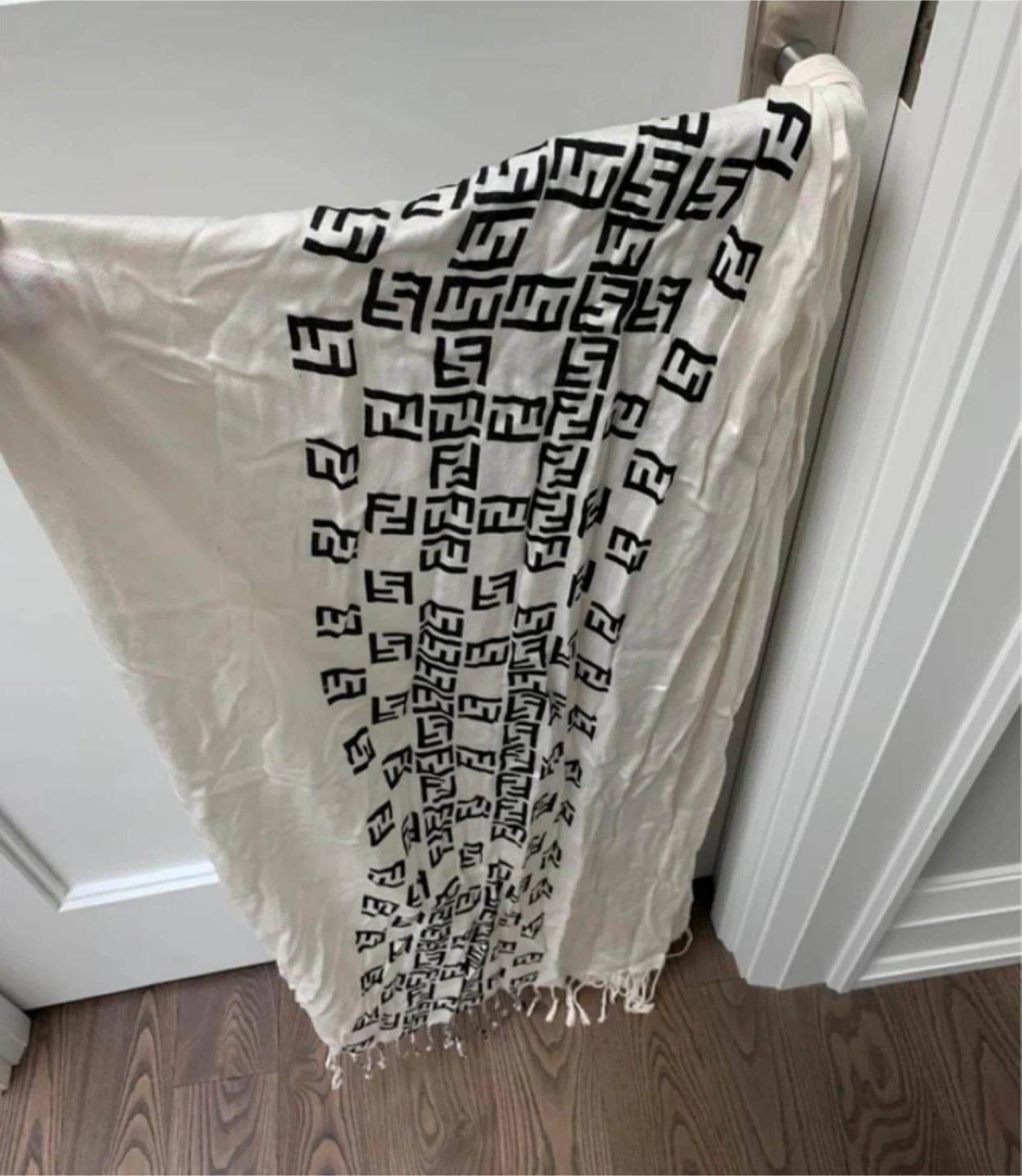 This is a white scarf featuring the iconic black FF logo pattern throughout. It has a soft fringe detail on the ends. It's made from a lightweight material, perfect for adding a touch of style to any outfit.