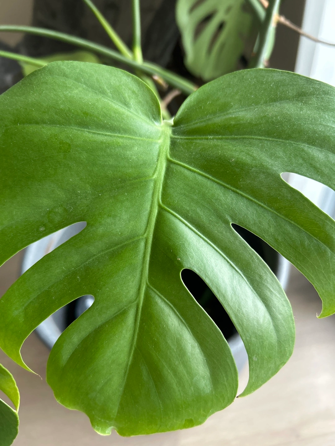 This is a beautiful, mature Monstera plant with split leaves. comes with a stylish grey pot, ready to liven up any room. The plant is healthy and well-cared for. It would be a great addition to your home or office space!