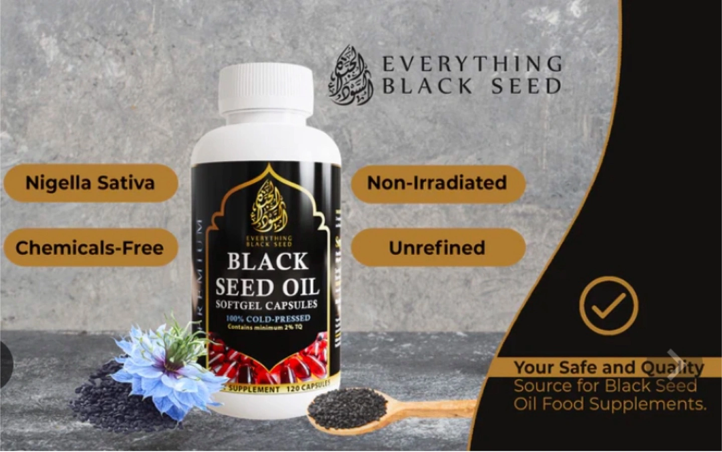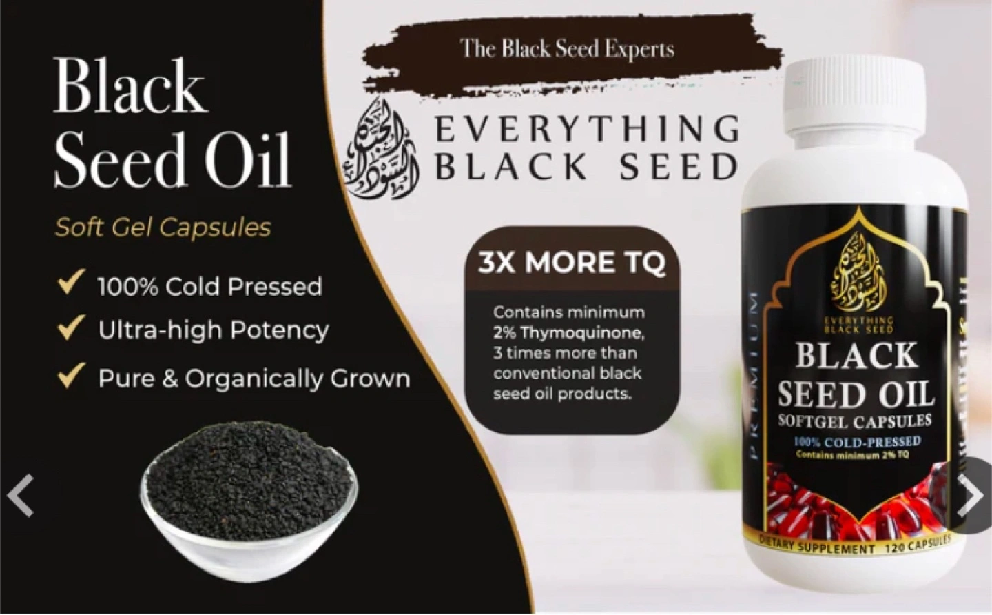 I am selling a premium quality brand new bottle of Everything Black Seed Oil, containing 120 softgel capsules, each with 1000mg of 100% cold-pressed black seed oil, ensuring a potent dose with a minimum of 2% TQ (Thymoquinone) for optimal health benefits. These capsules are perfect for anyone looking to add a natural supplement to their daily routine.