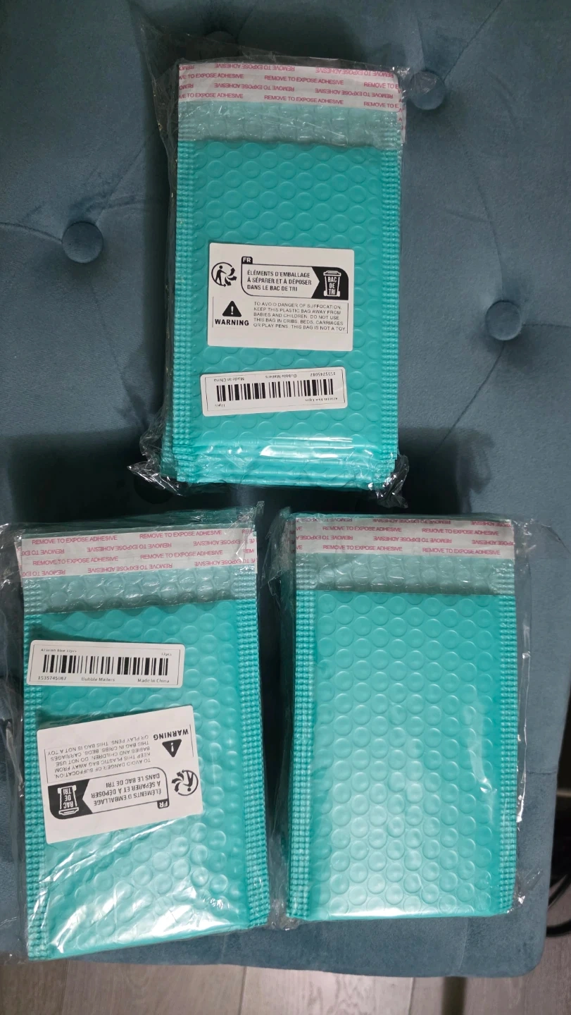 Set of three padded mailers in a teal colour. These envelopes are bubble-lined for extra protection. Each bag is 11cm x 15cm (4.3in x 5.9in).