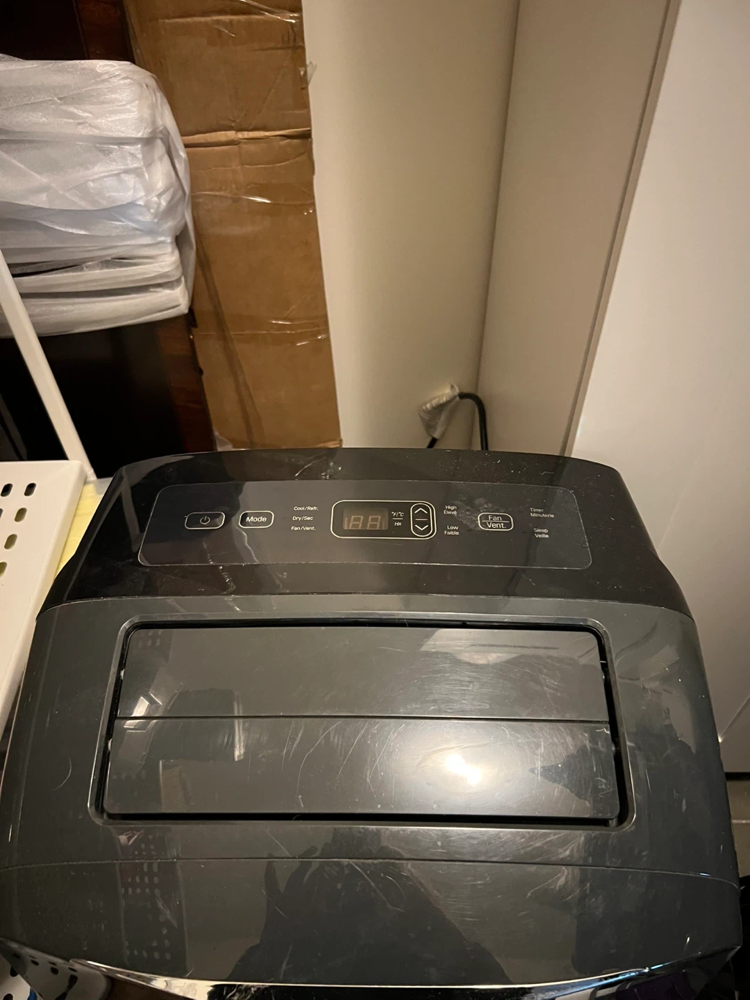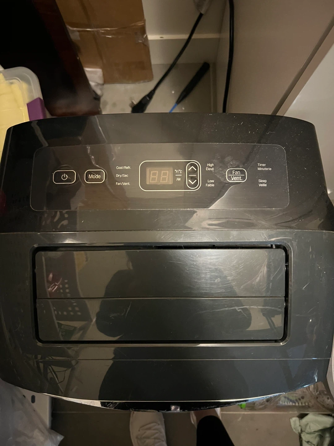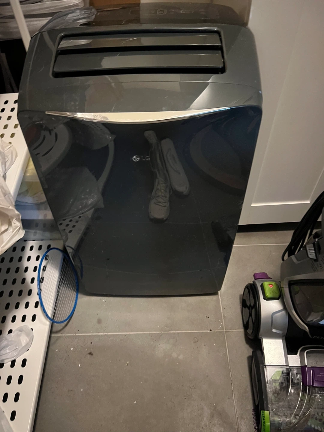 Selling an LG portable air conditioner in black. It has a digital display and multiple modes including cool, dry, and fan. It's in good working condition. Needs filter cleaning, extra tubes and cover boards are included.