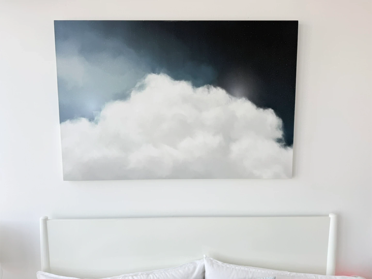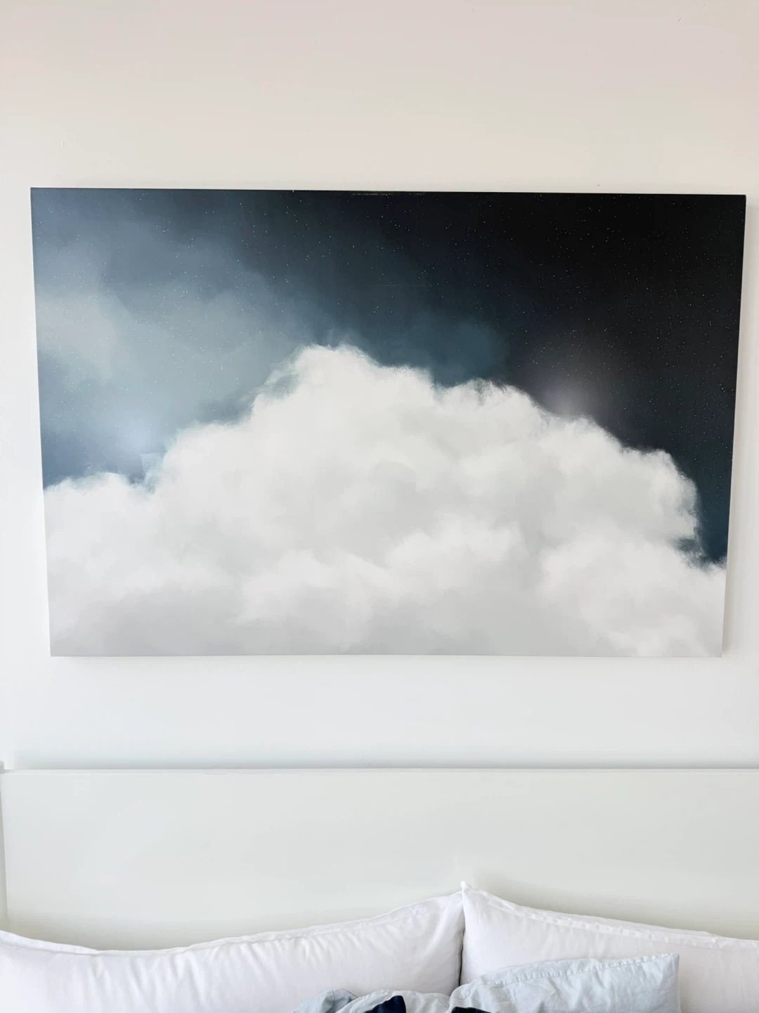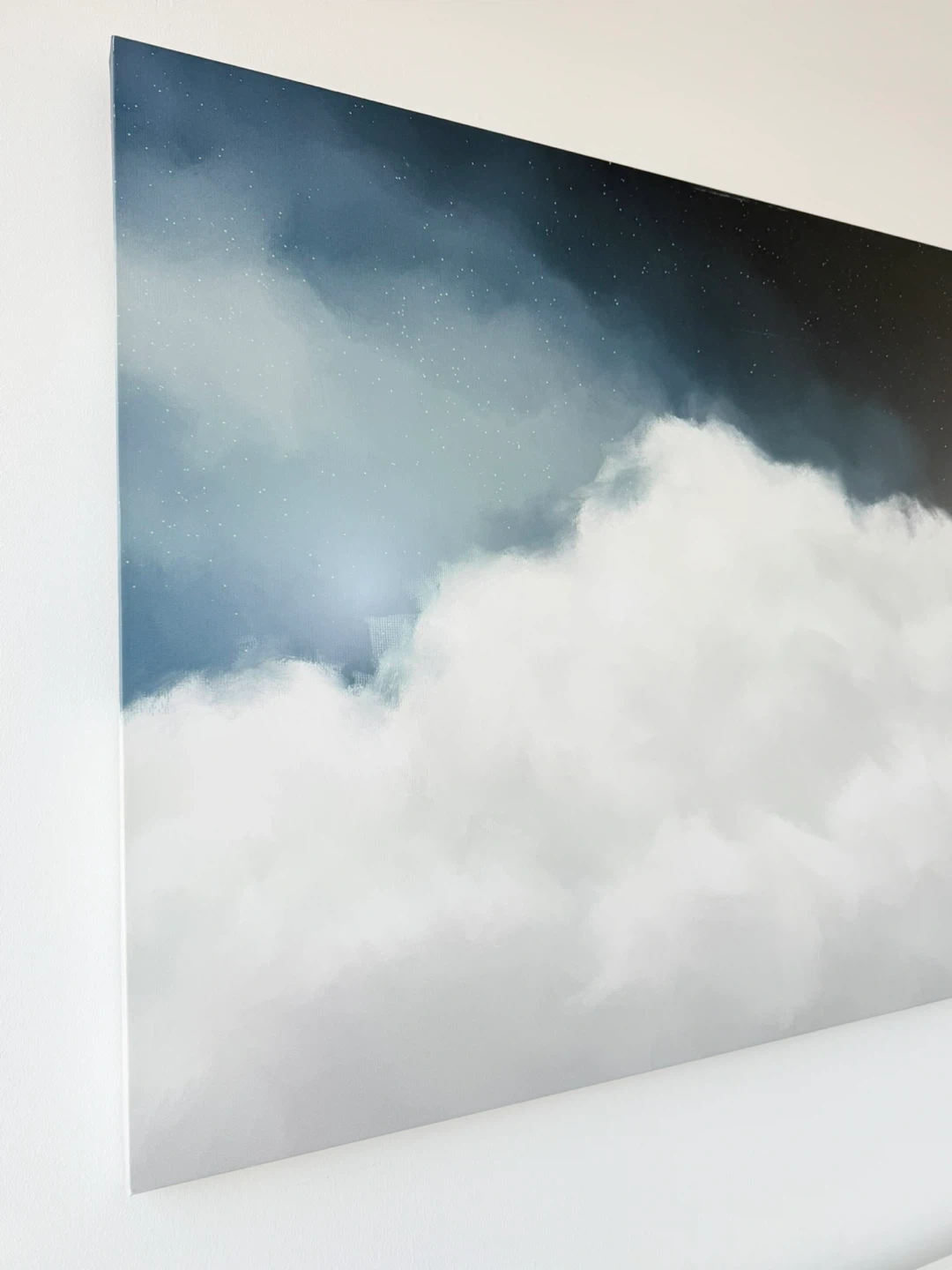 This large canvas print features a dreamy depiction of clouds against a starry night sky. It's a beautiful piece that can add a serene touch to any room. The artwork is printed on canvas, ready to hang.