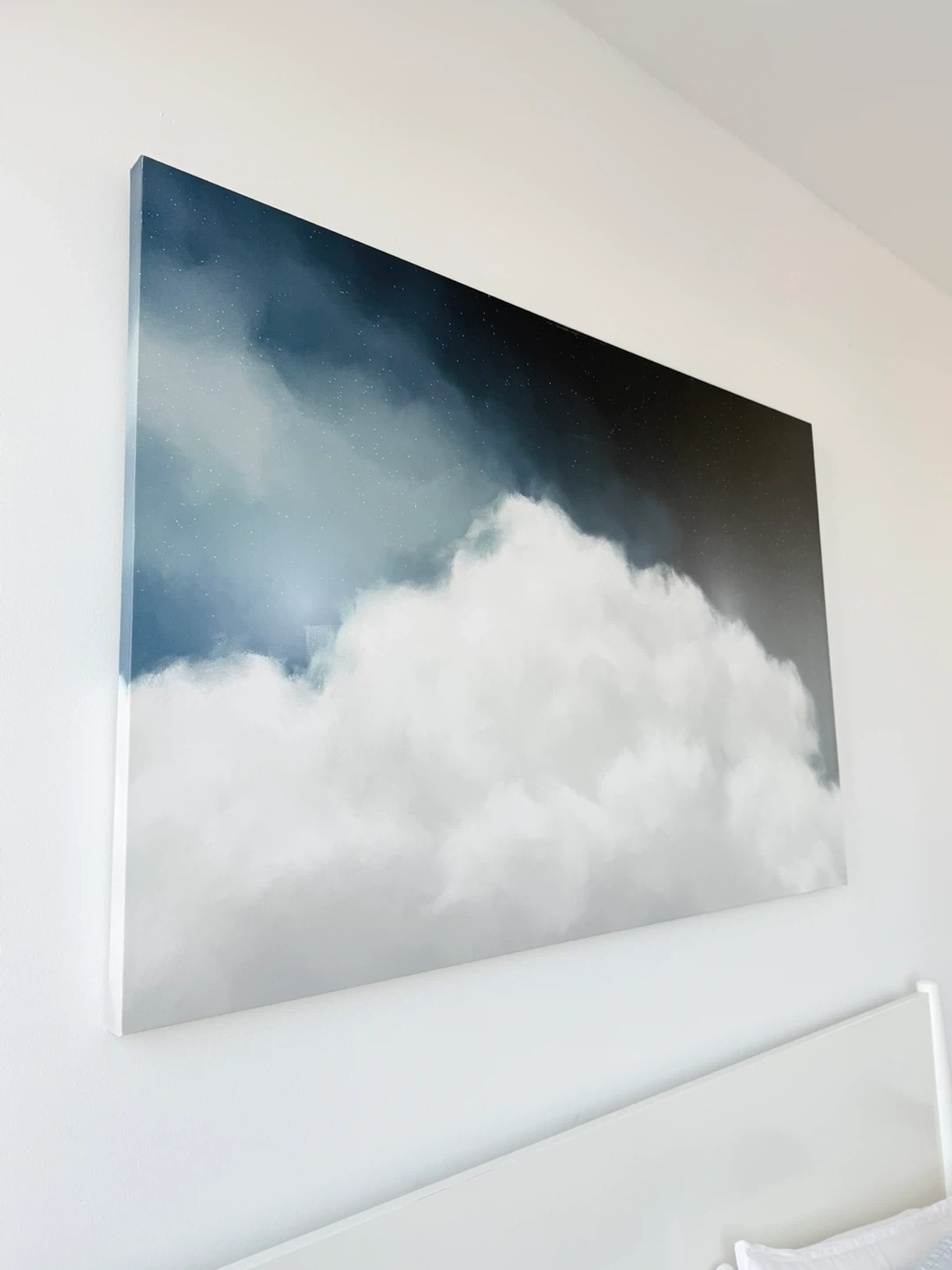 This large canvas print features a dreamy depiction of clouds against a starry night sky. It's a beautiful piece that can add a serene touch to any room. The artwork is printed on canvas, ready to hang.