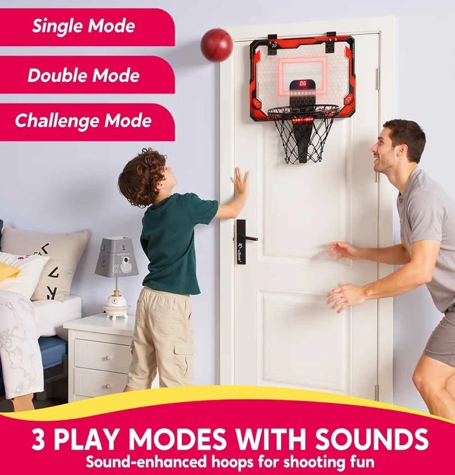 This set includes a glowing LED basketball board with remote control for light adjustments, 4 basketballs, an air pump, and a ball rack for non-stop fun. It's easy to set up and fold away, perfect for any room size. Made with durable, kid-safe materials and rounded edges for safe play. Built to last through enthusiastic play.