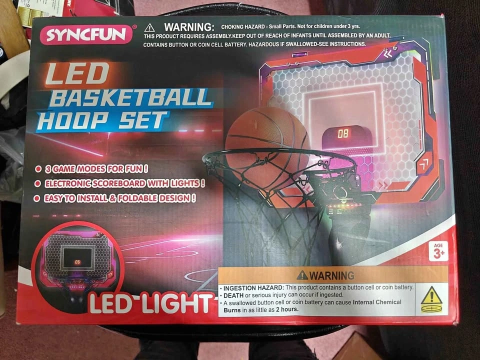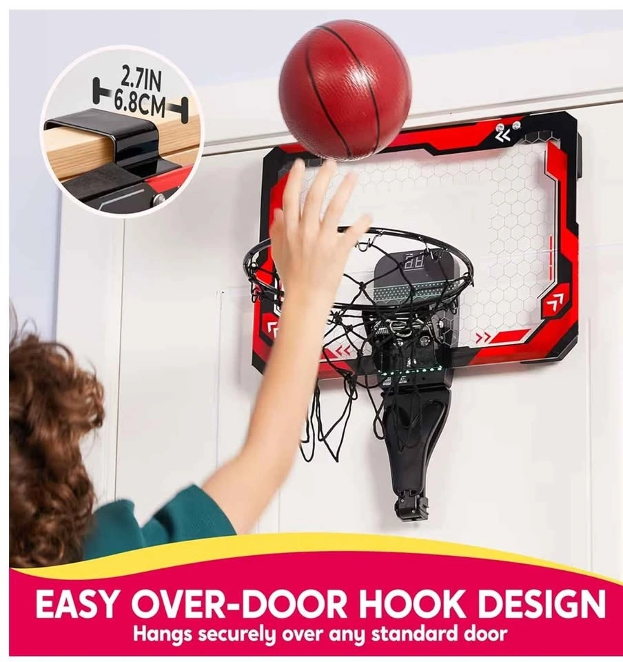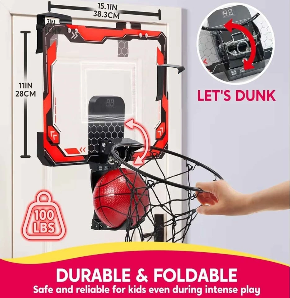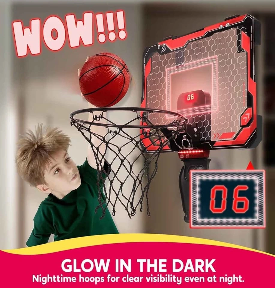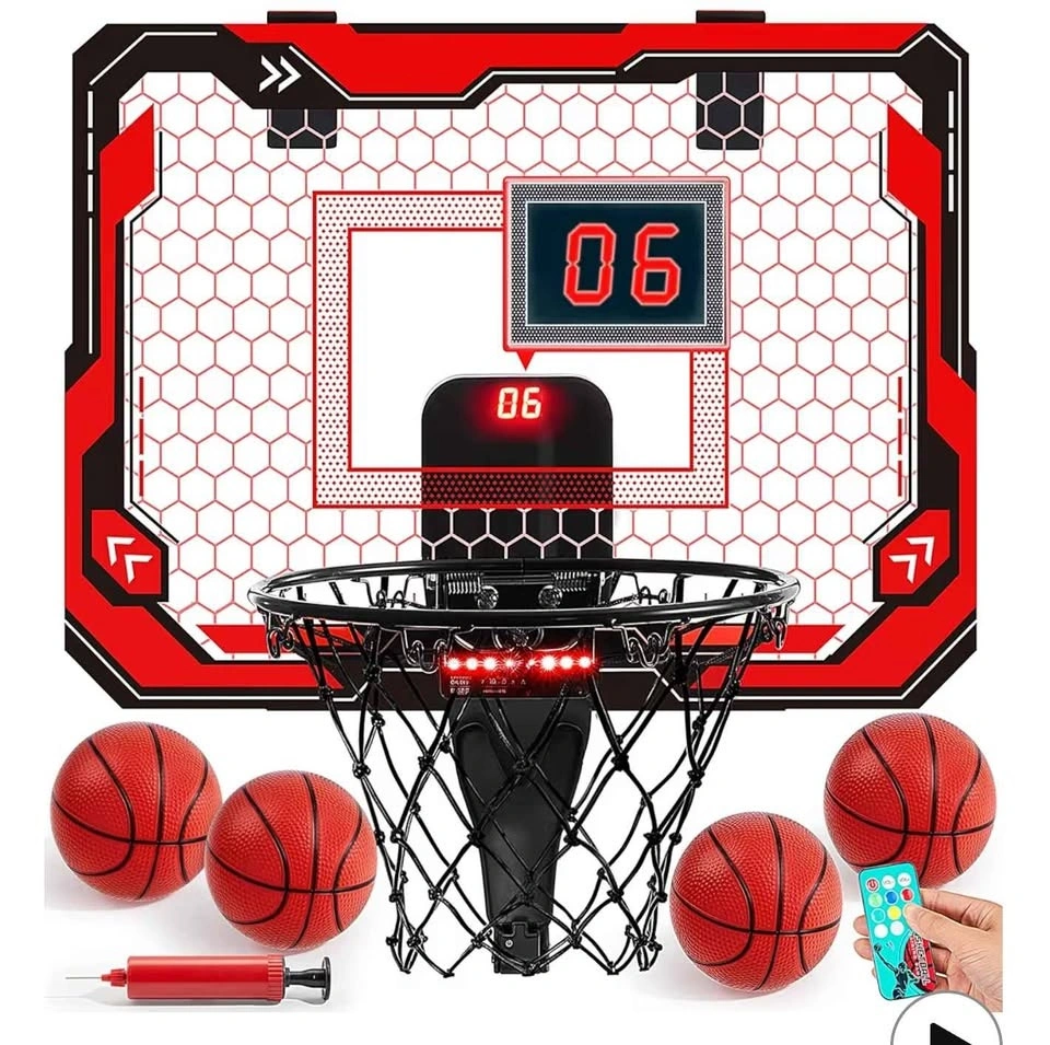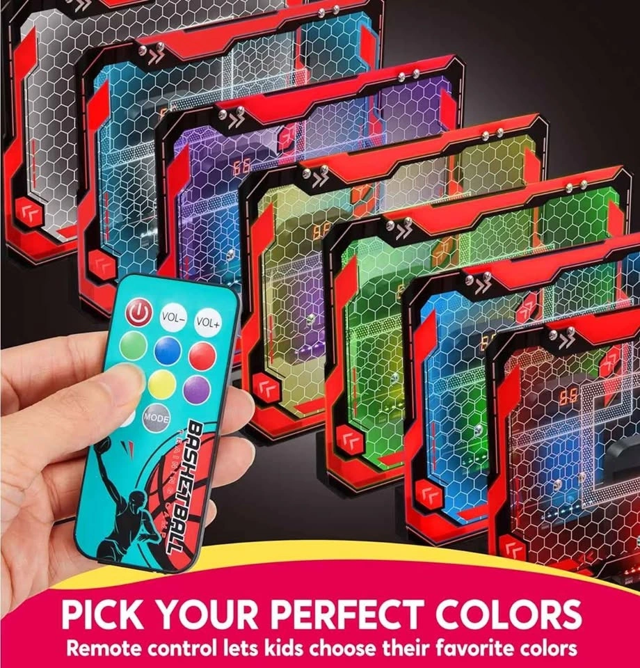 This set includes a glowing LED basketball board with remote control for light adjustments, 4 basketballs, an air pump, and a ball rack for non-stop fun. It's easy to set up and fold away, perfect for any room size. Made with durable, kid-safe materials and rounded edges for safe play. Built to last through enthusiastic play.