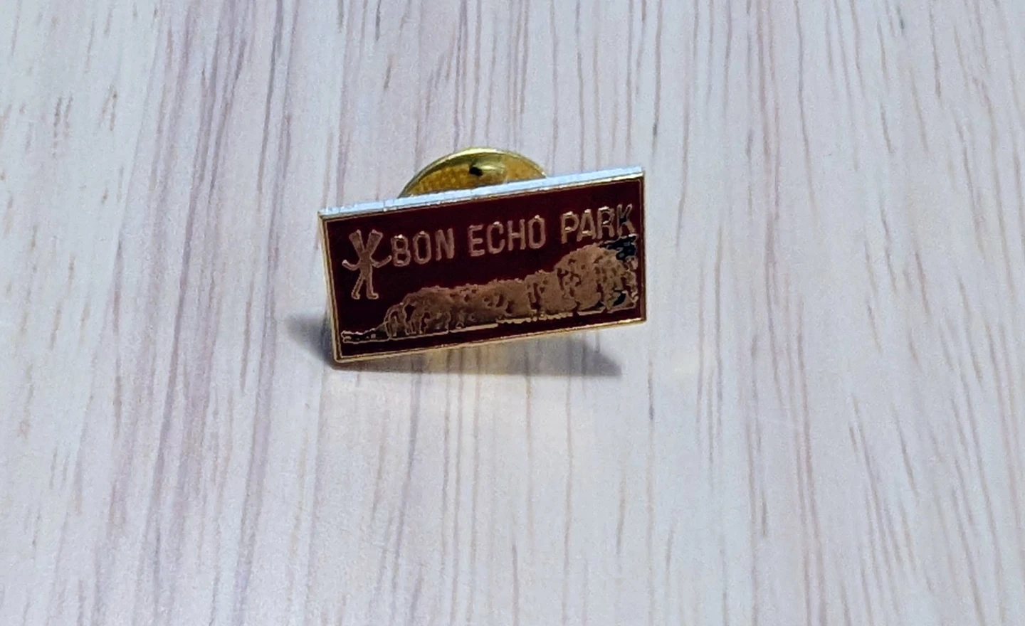 Commemorative lapel pin from Bon Echo Park. Features a red rectangular background with gold lettering and a silhouette of wildlife along the bottom. Pin backing is intact.