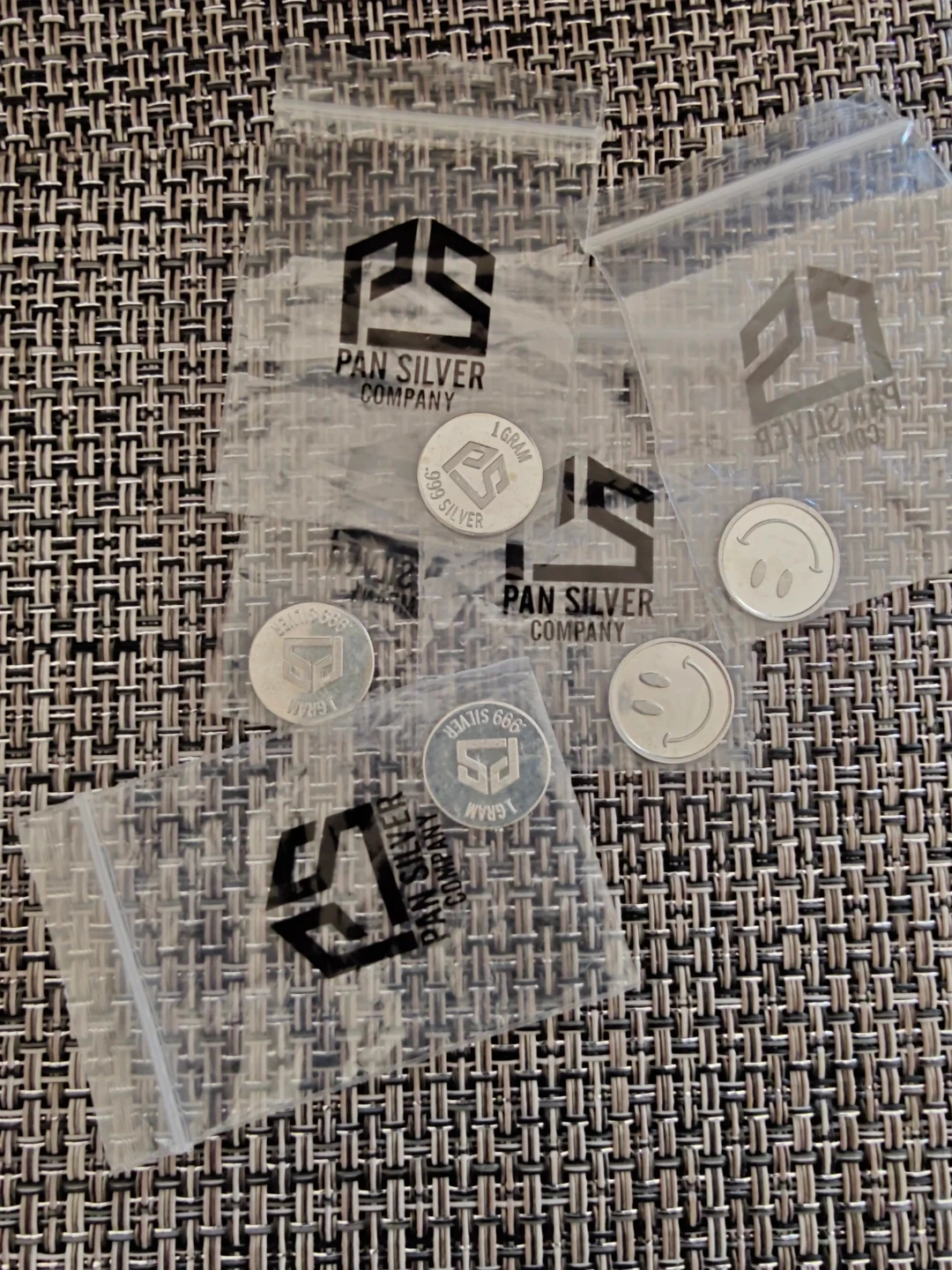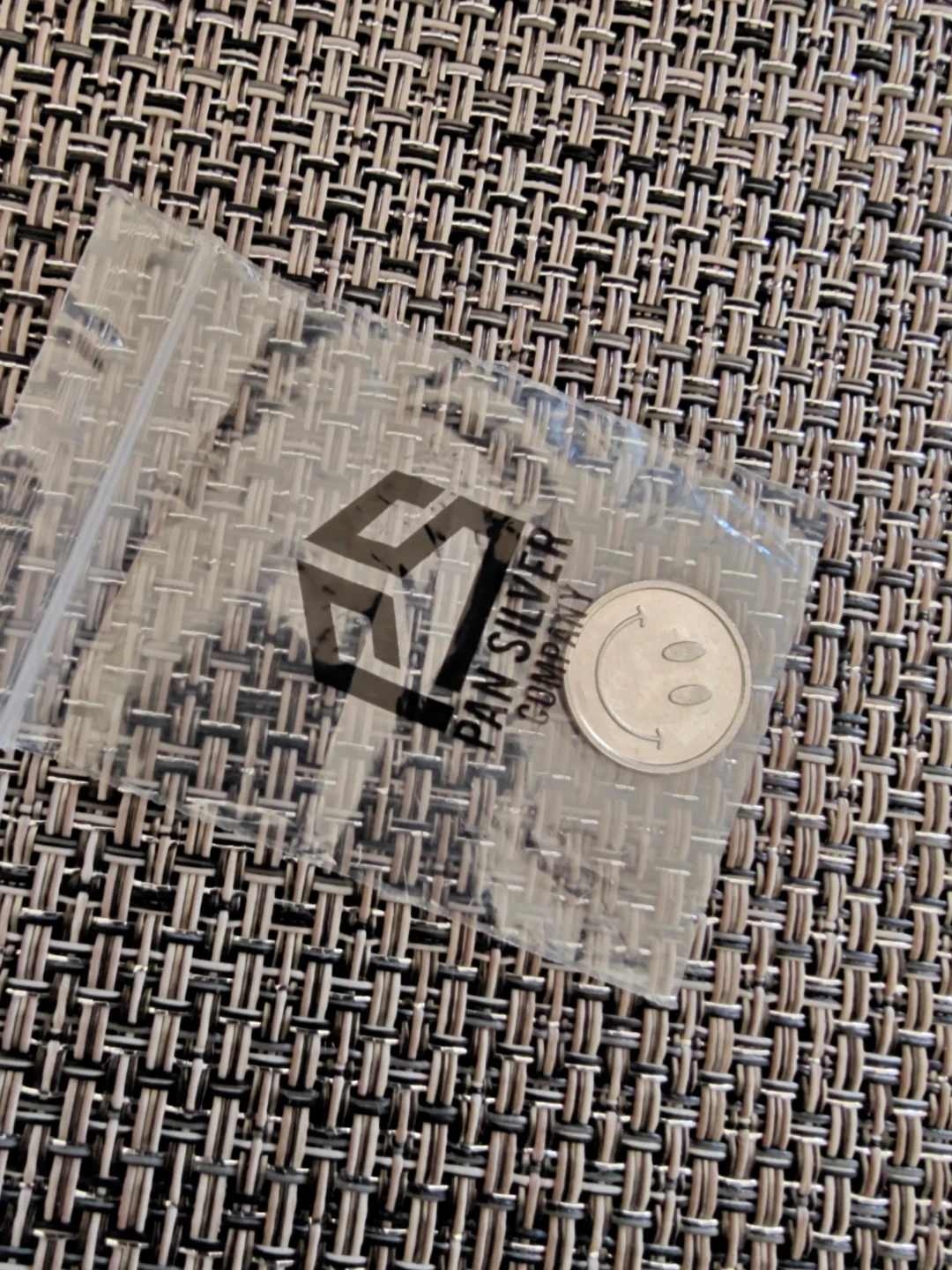 Pan Silver Company 1 gram .999 fine silver rounds. Features a smiley face design. Each round comes in its own sealed plastic pouch. I am asking $20 a gram no reasonable offer will be refused.