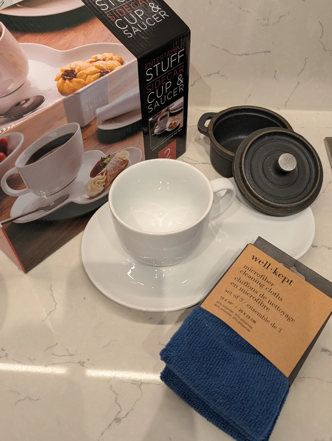 Includes 1 cup & saucer, a mini cast-iron pot with and a set of 3 microfiber cleaning cloths.