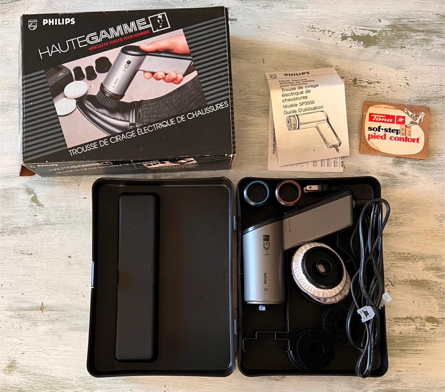 This is a Philips HighGear electric shoe polishing kit. It includes the electric polisher, several brushes, and polishing pads. Comes with original box and manual. Great for keeping your dress shoes looking sharp!