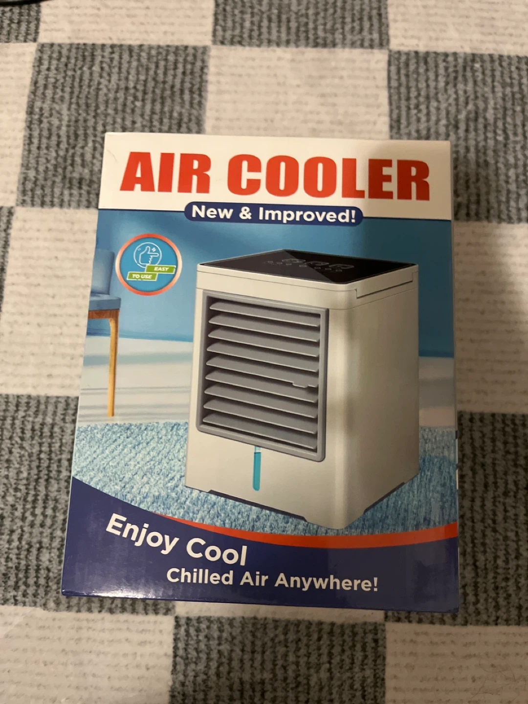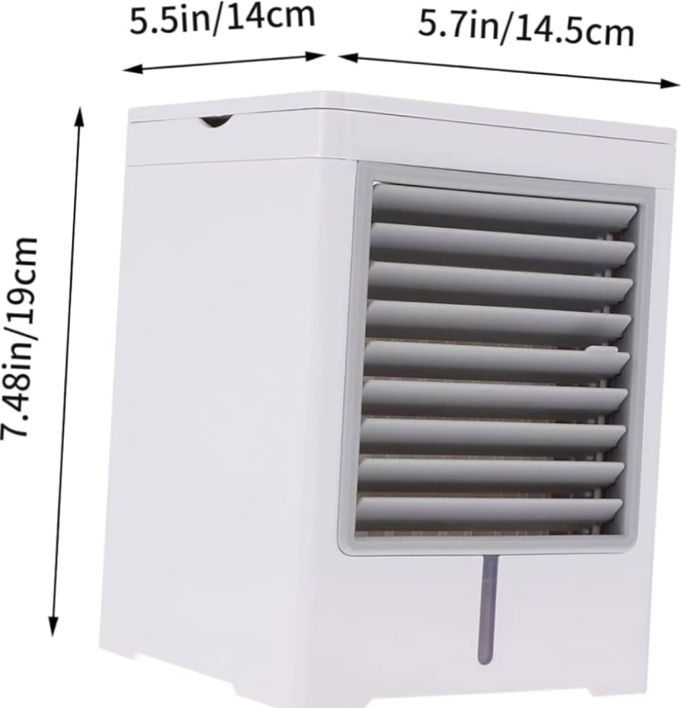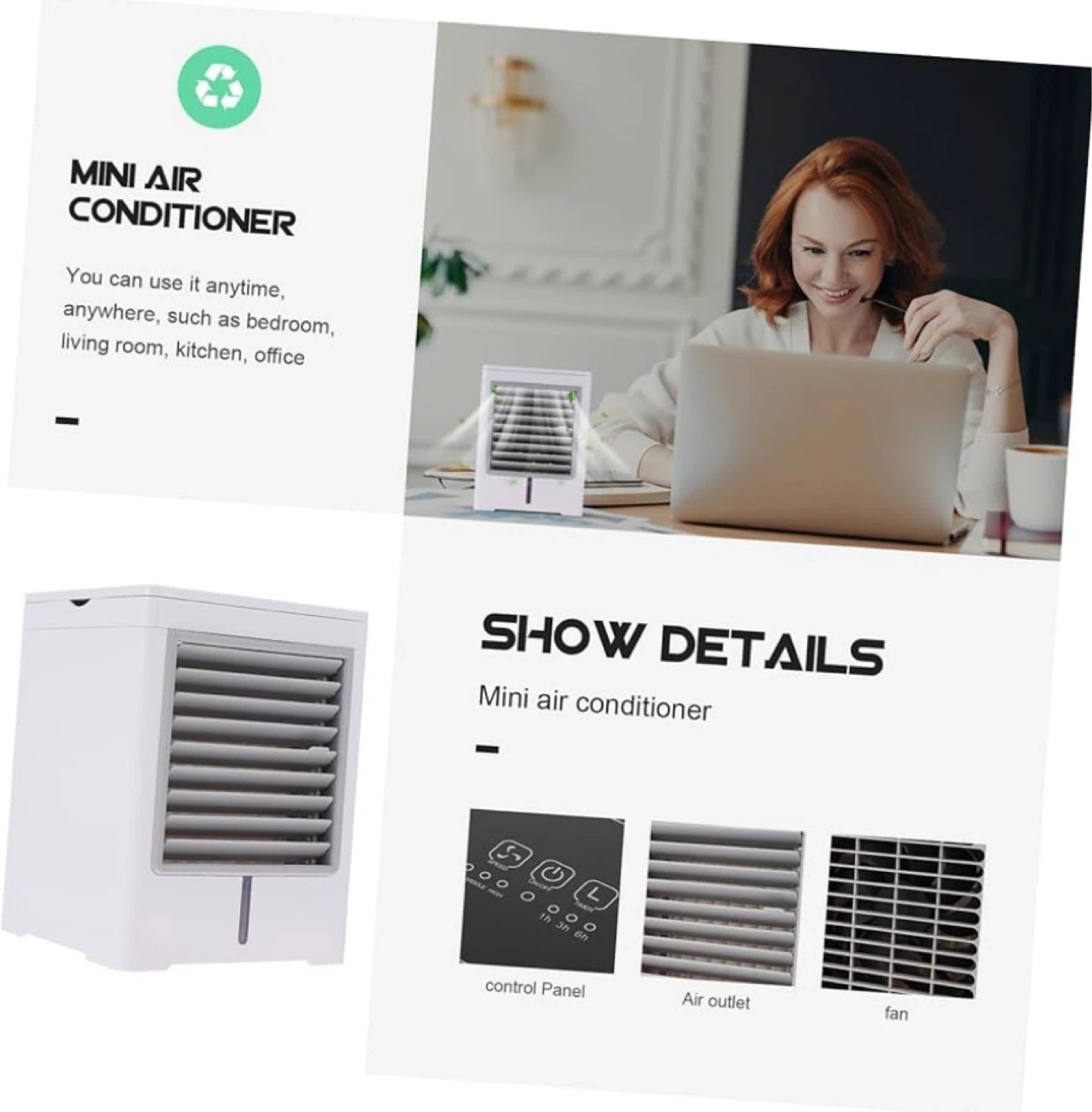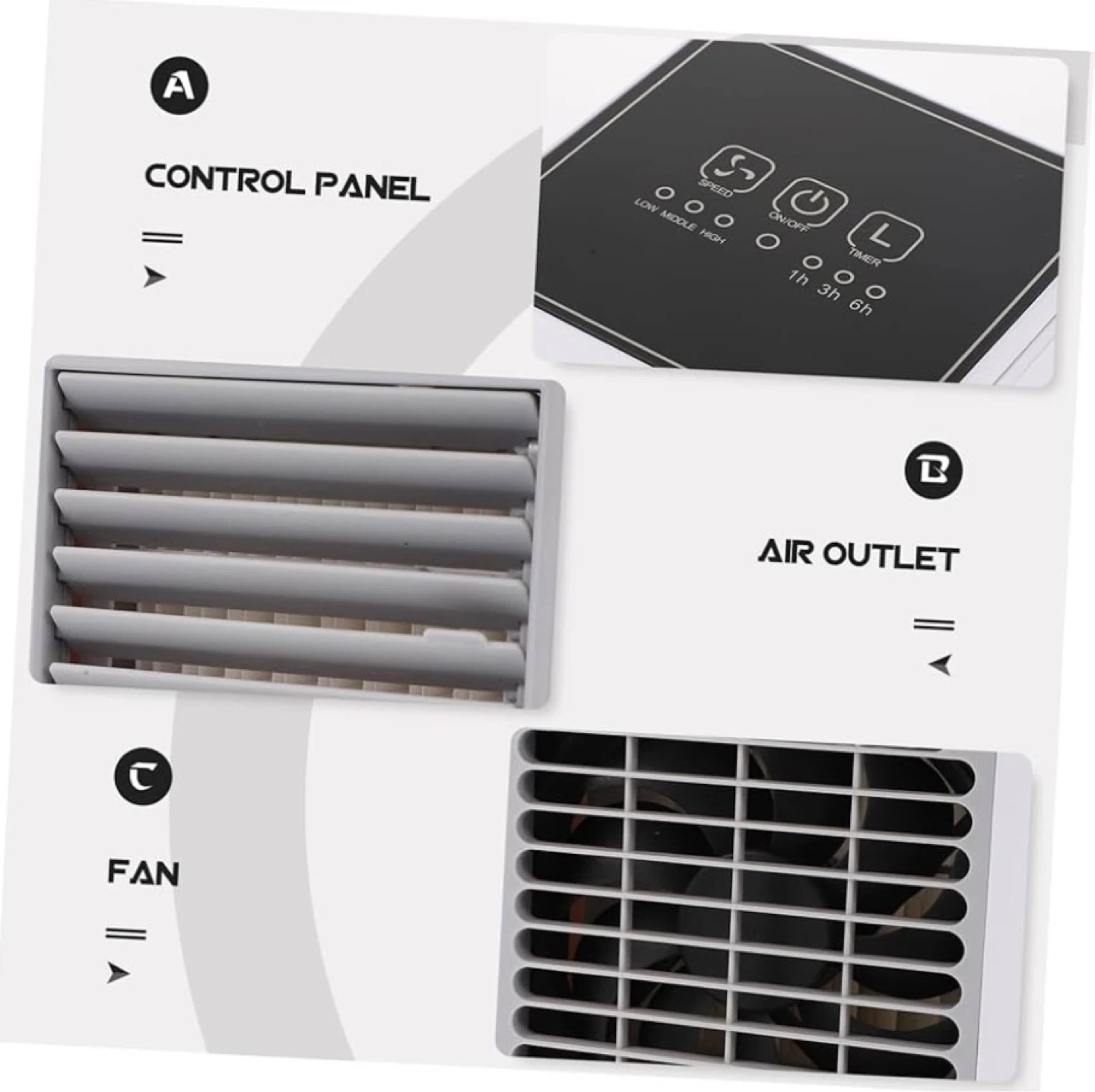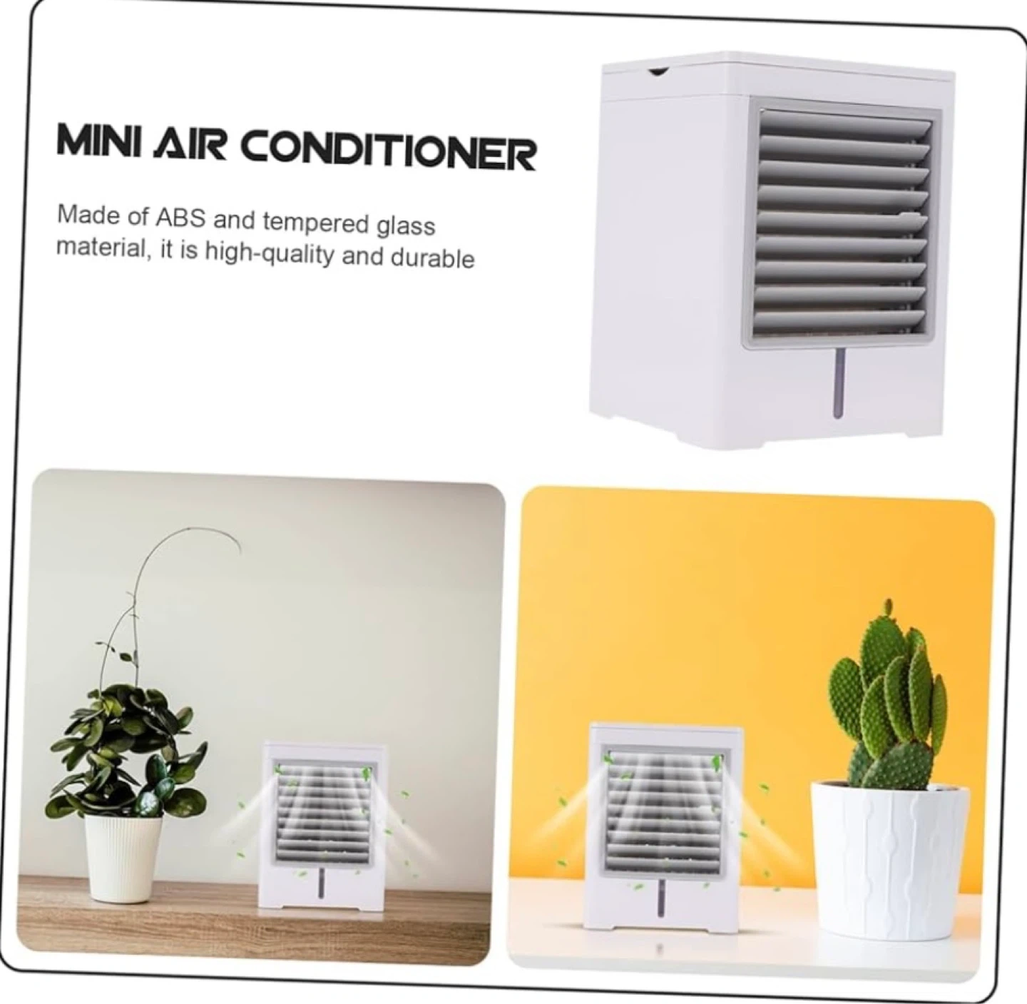Mini air conditioner made of ABS and tempered glass material. It features 3 speed settings and a timer with 1, 3, or 6 hour options. This unit measures 5.7in x 5.5in x 7.48in.
