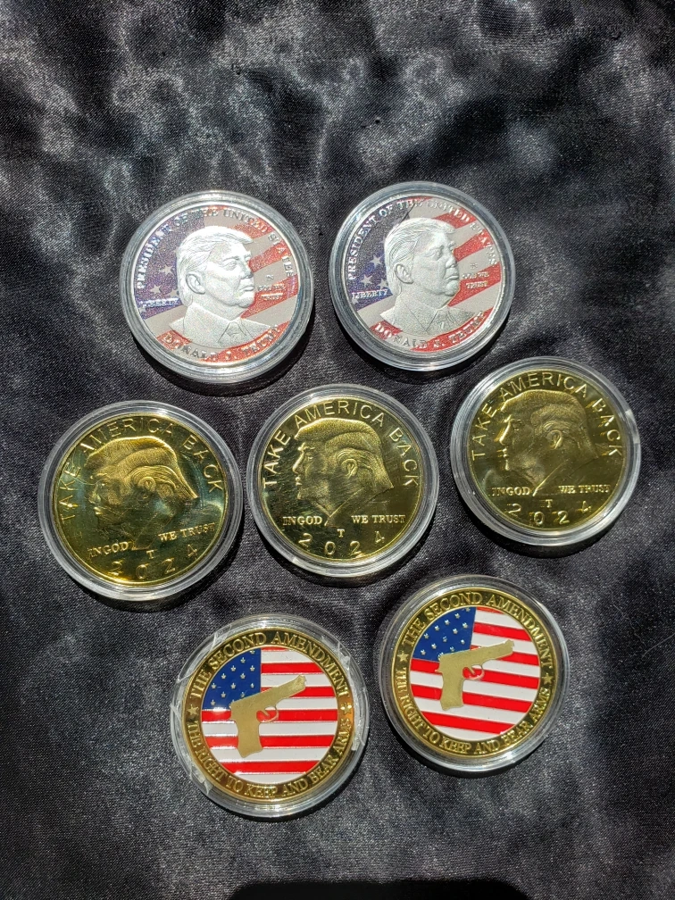 Gold tone novelty Coins. 3x Take America Back 2024 (back is Presidential Seal). 2x gold "The Second Amendment" back has Amendment written out. 2x silver Trump's bust, the back is Presidential Seal. NO DATE STAMP. BOUGHT IN 2023, right after the coupe attempt he brought to BIDEN.