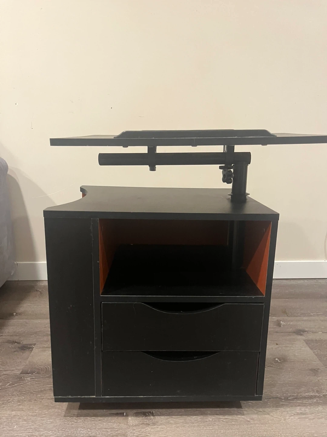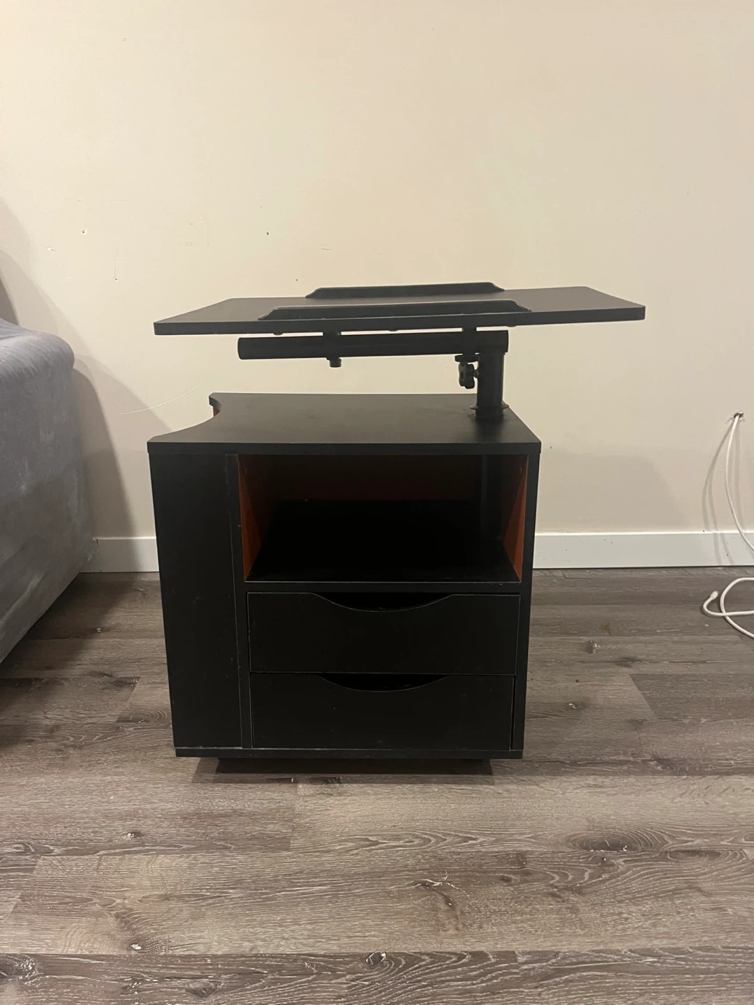 This rolling desk cart is black and features two drawers for storage. It also has an adjustable tray on top, perfect for a laptop or monitor. The cart is on wheels for easy mobility. Made of durable particle board.