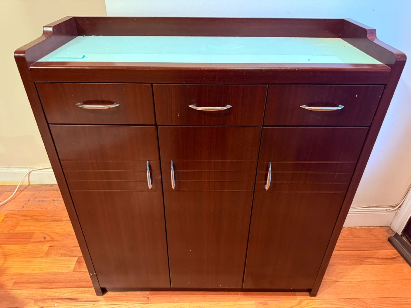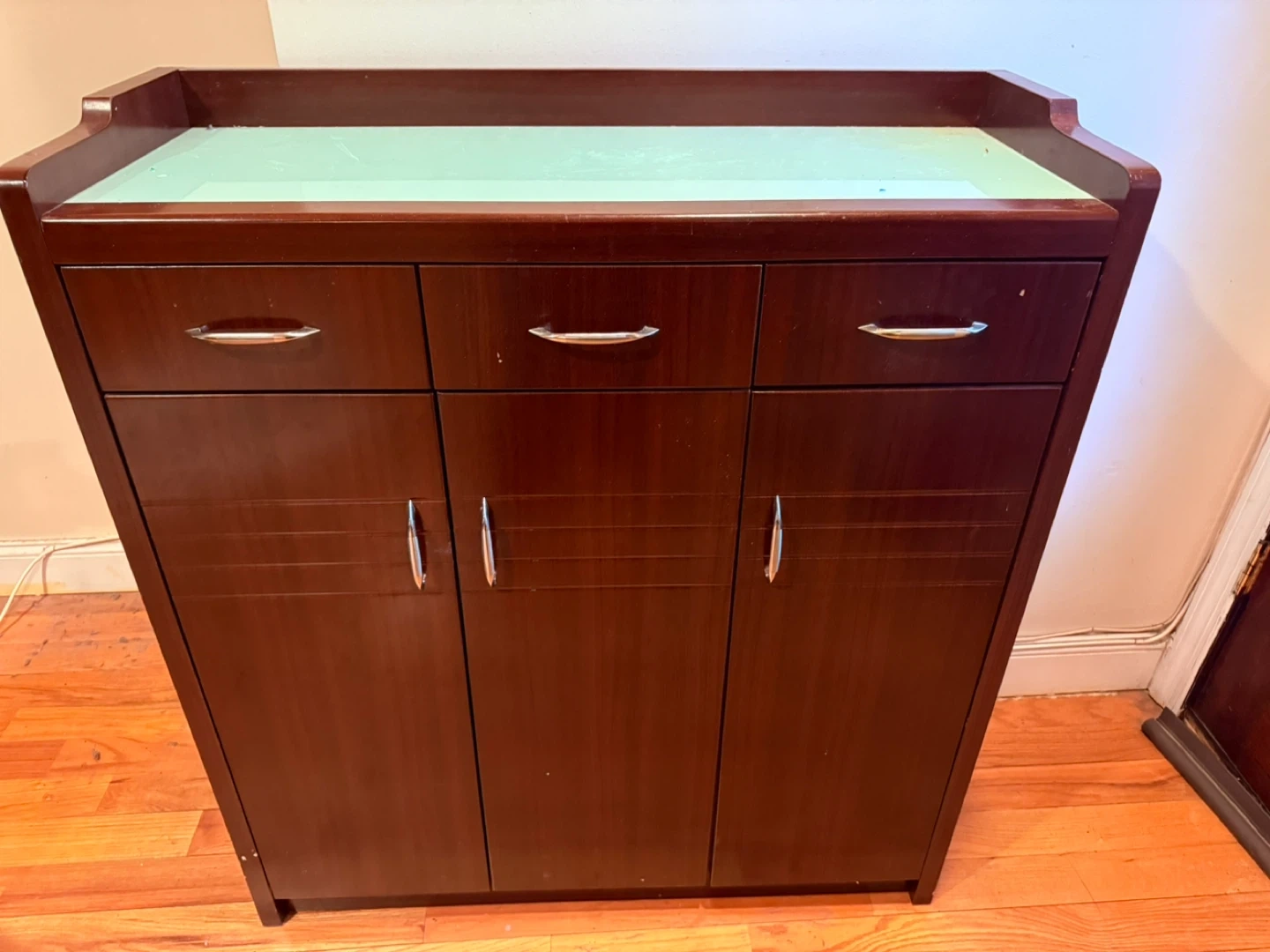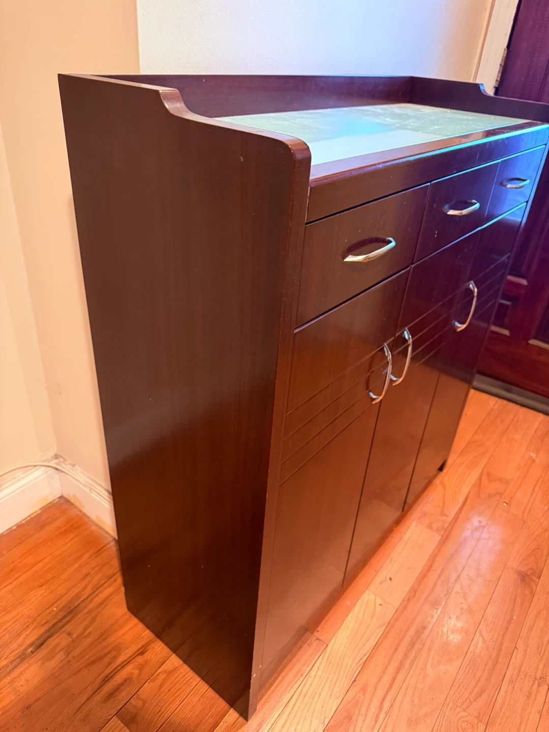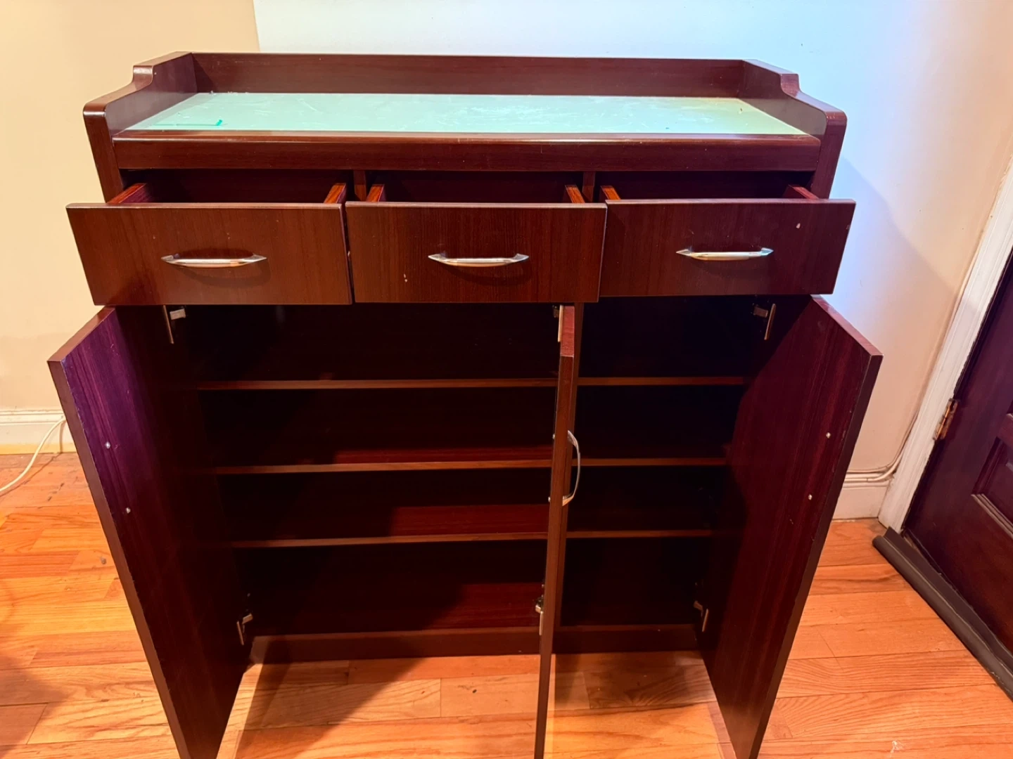 This shoe cabinet features a rich wood finish. It has three top drawers and three lower cabinet doors for storage.