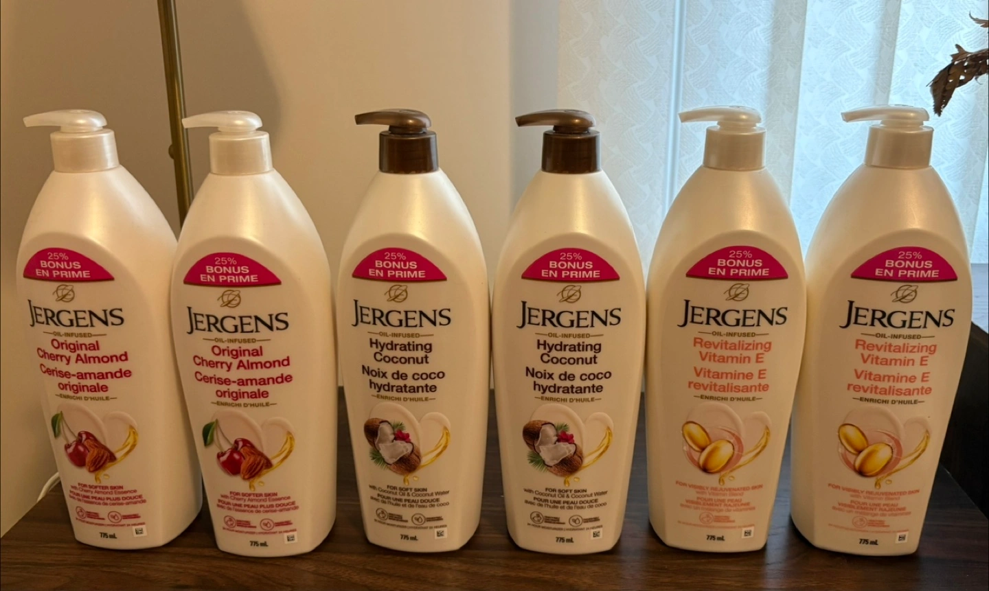 I have a few bottles of Jergens oil-infused body lotion available. Each bottle contains 775ml of lotion. Choose from: