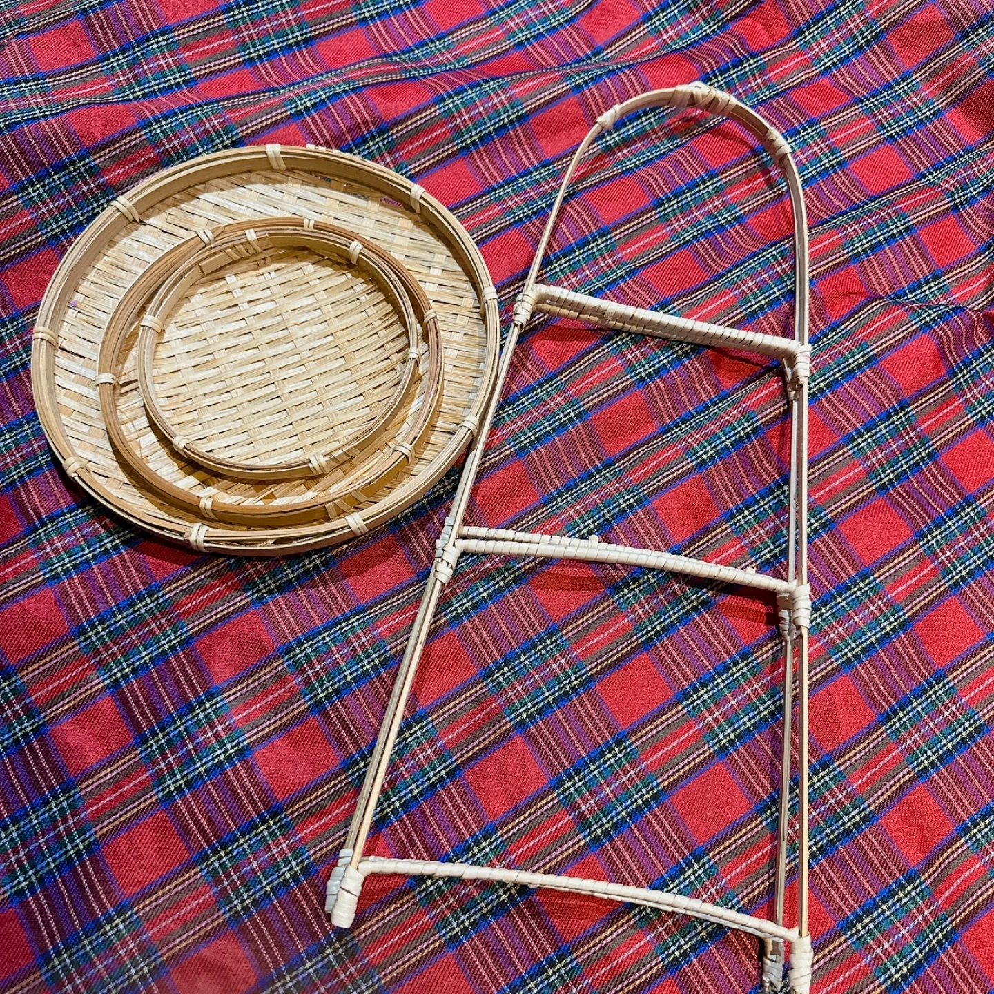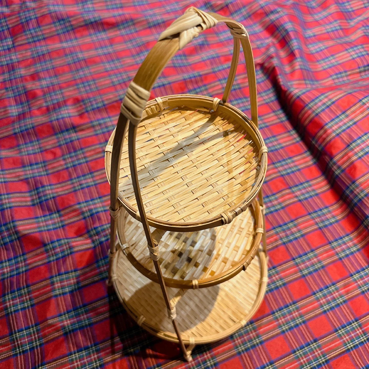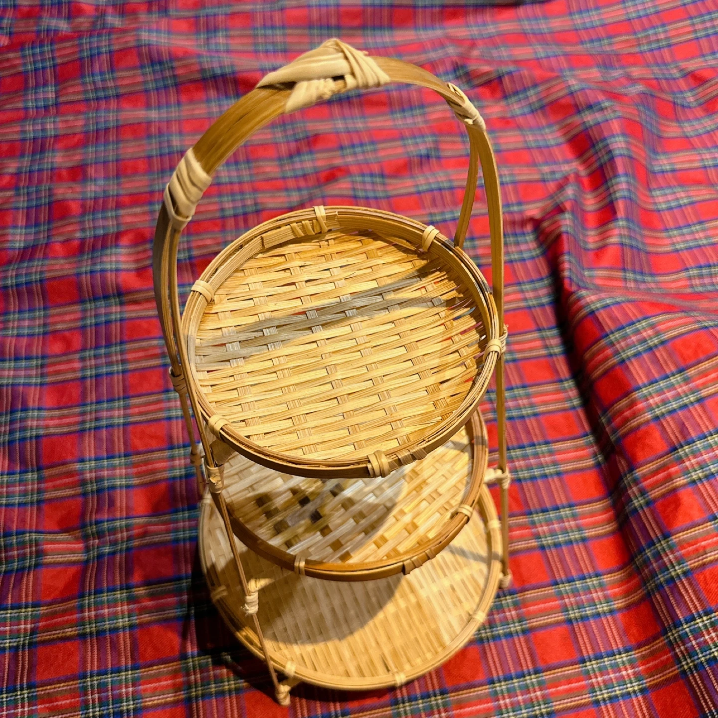 This bamboo tiered serving tray is great for displaying snacks or treats. It's made of woven bamboo and has a sturdy handle for carrying. The trays can be disassembled for storage. Useful for parties or everyday use!
