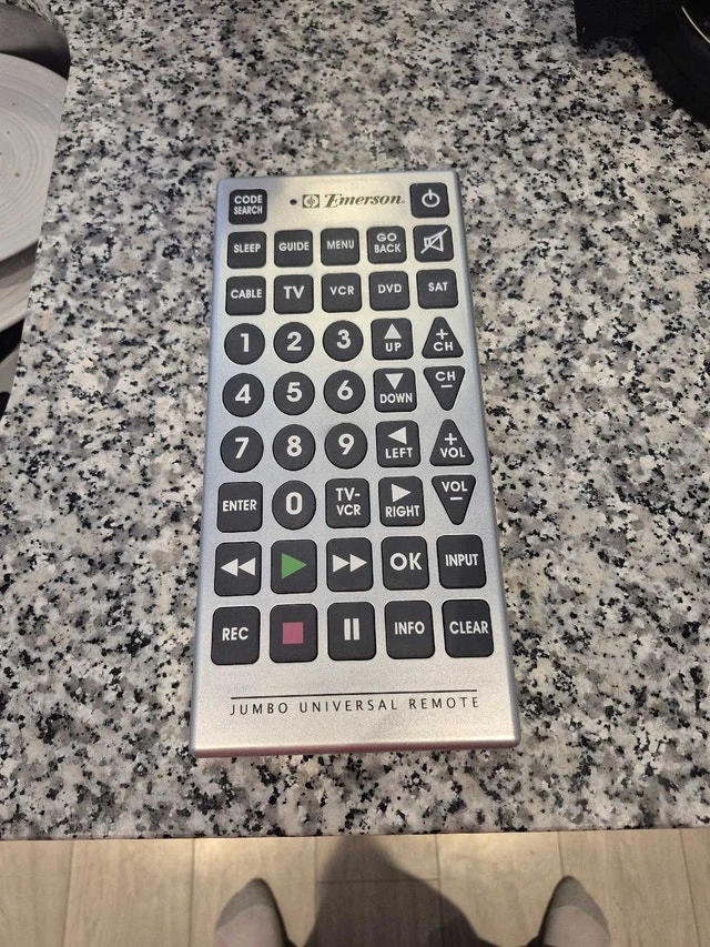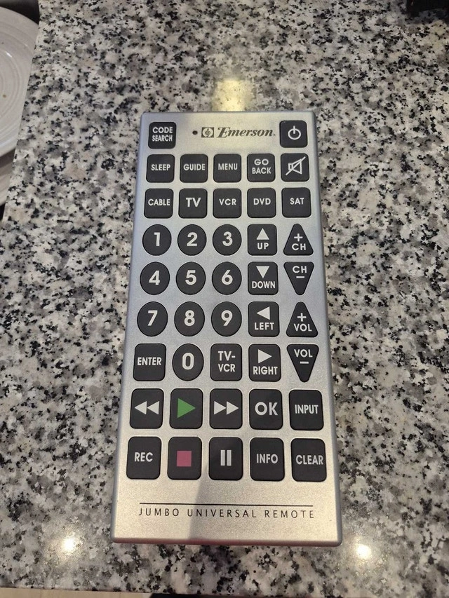 Control your devices with ease using this Emerson jumbo universal remote! In used condition, it features oversized buttons for easy navigation and is compatible with a variety of devices.